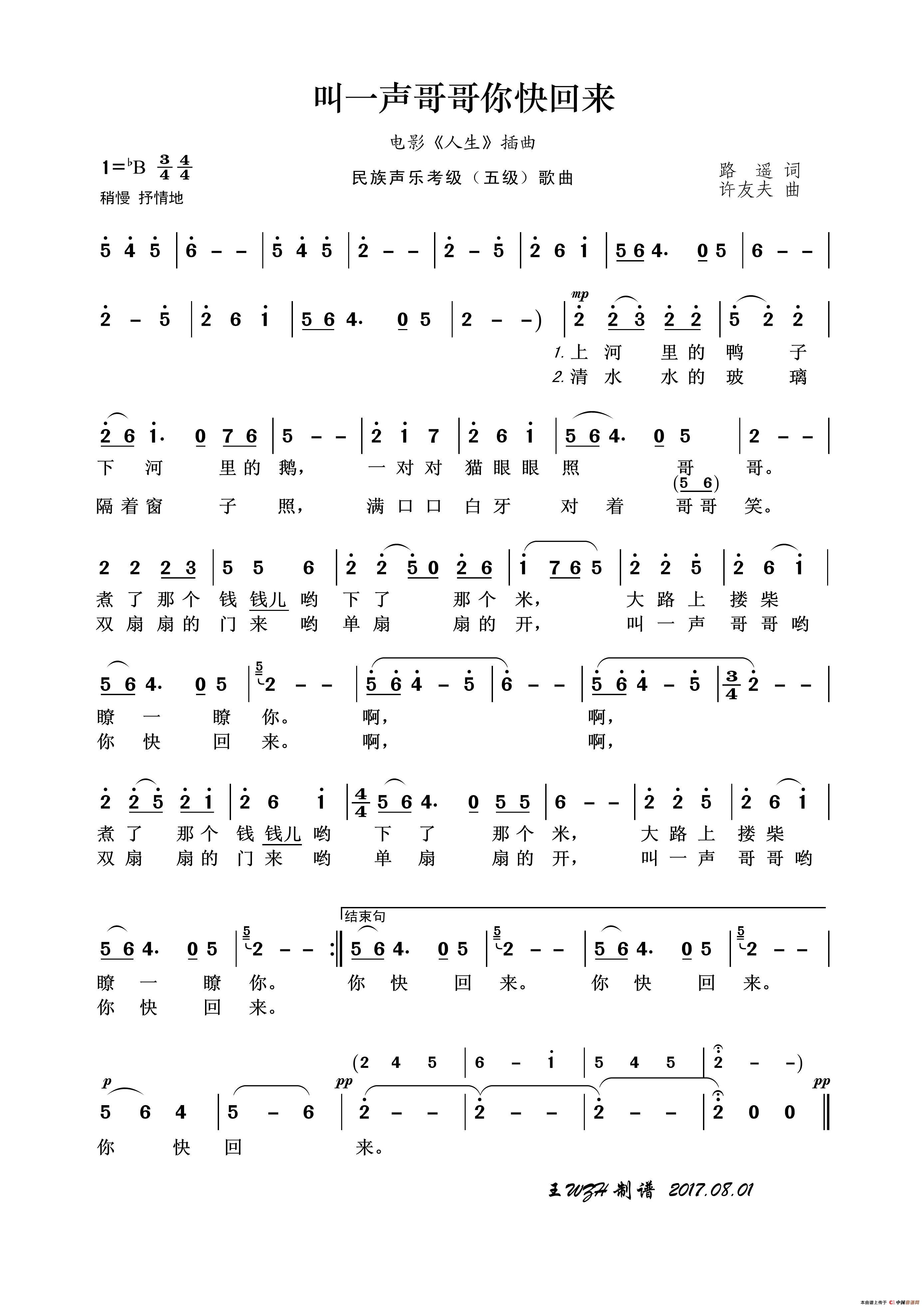 民族声乐考级歌曲:叫一声哥哥你快回来相关五线谱