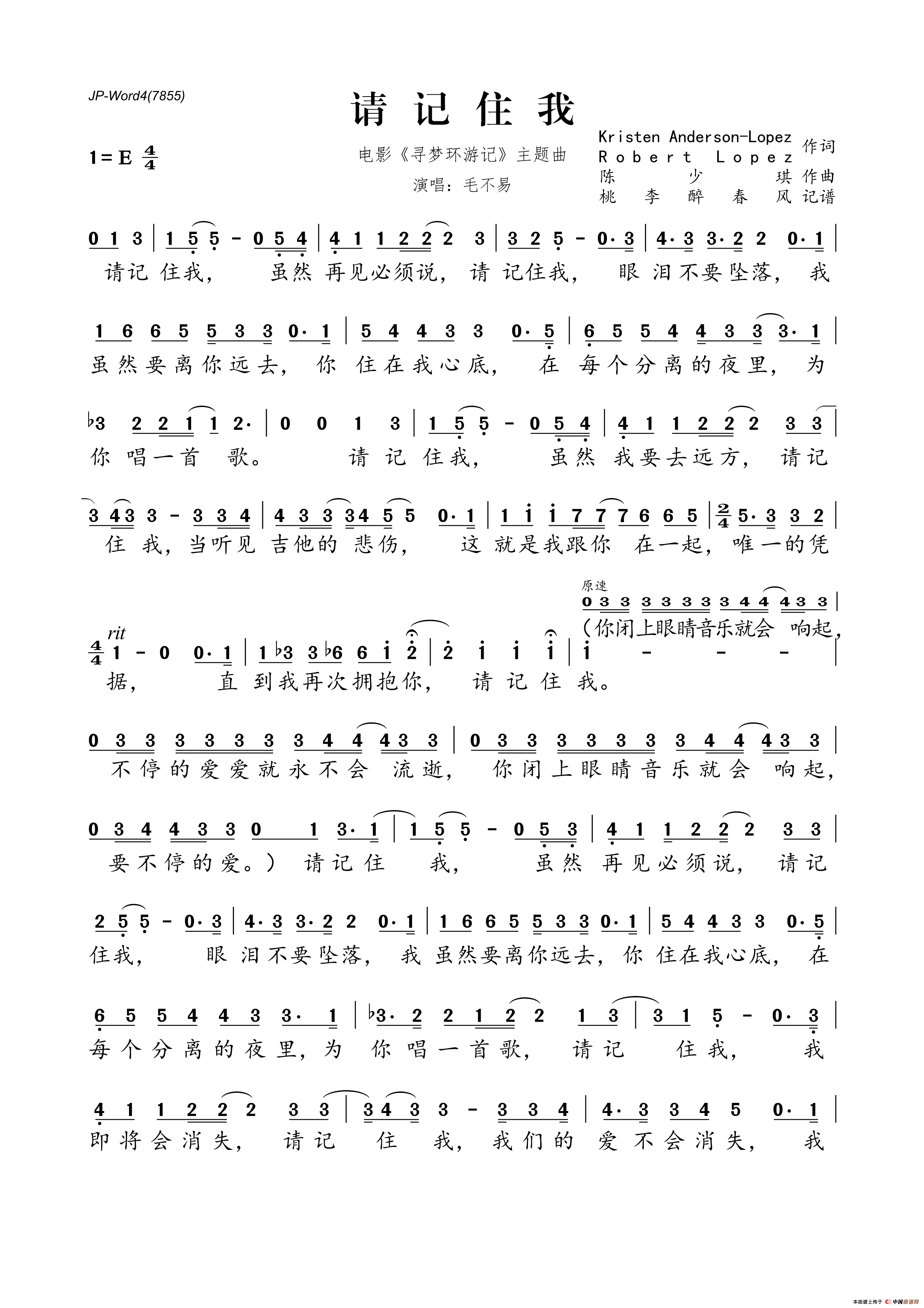 请记住我(《寻梦环游记》中文主题曲)相关五线谱
