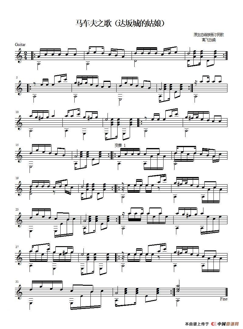 达坂城的姑娘(版本1)(原生态民歌 吉他独奏、五线谱)
