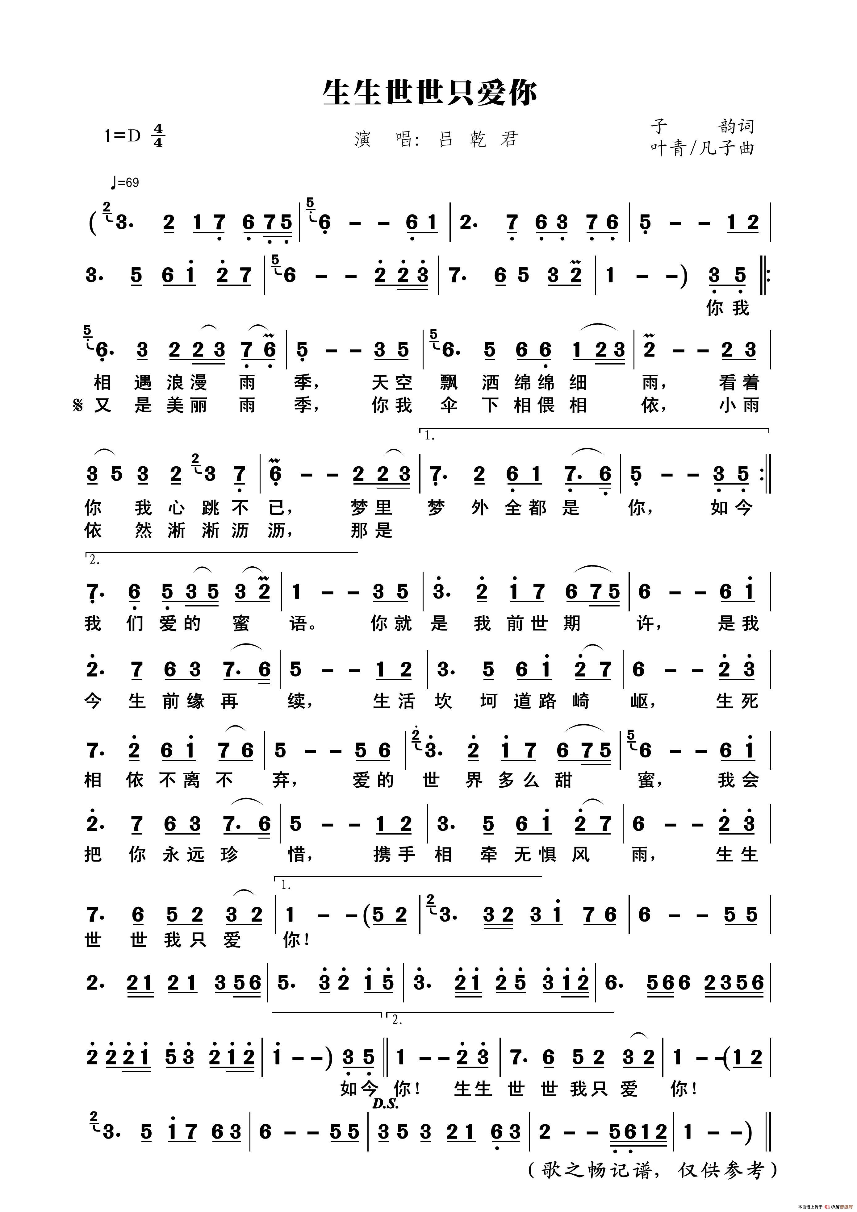 生生世世只爱你(子韵词、叶青/凡子曲)相关五线谱