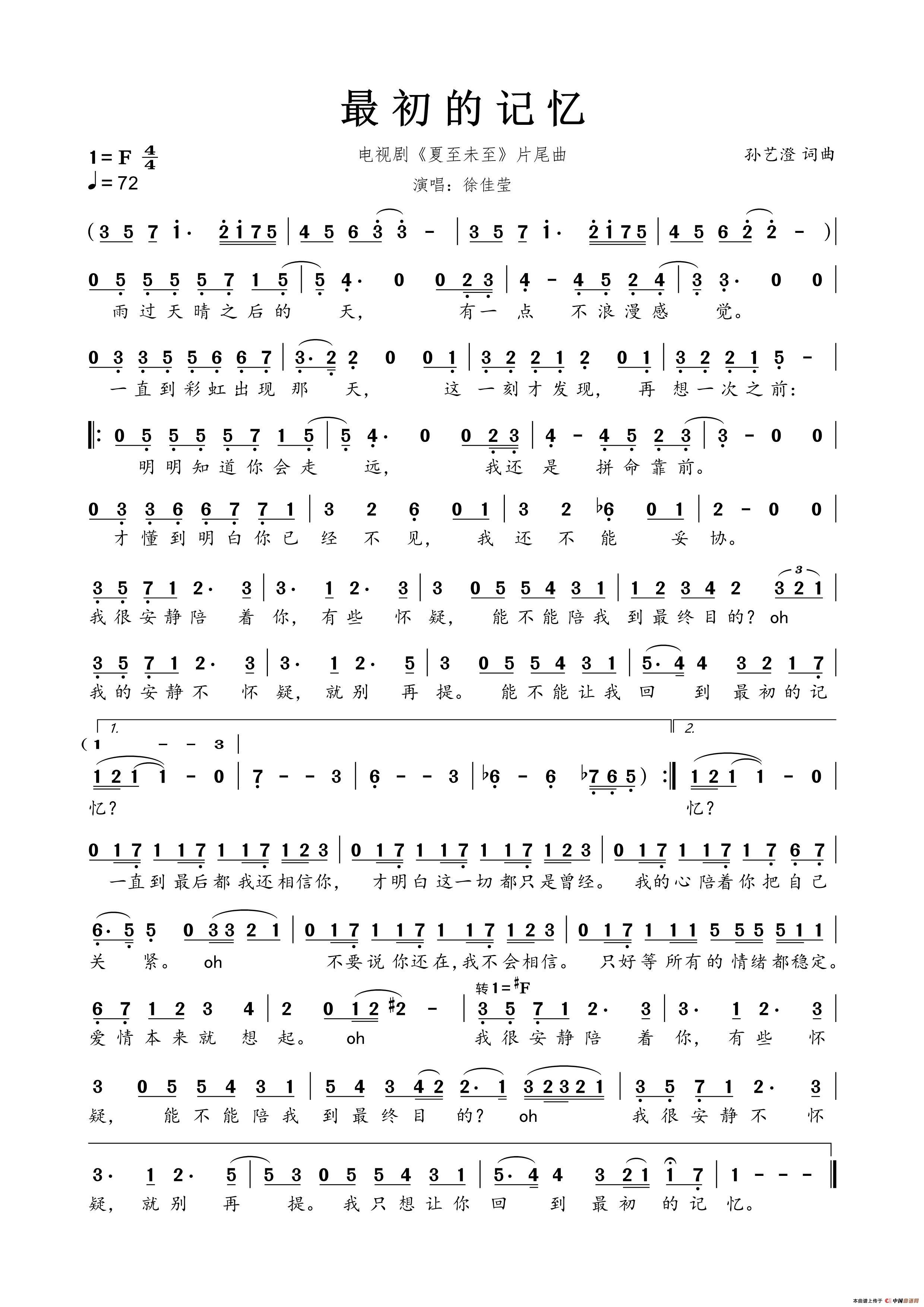 最初的记忆(《夏至未至》电视剧片尾曲)相关五线谱