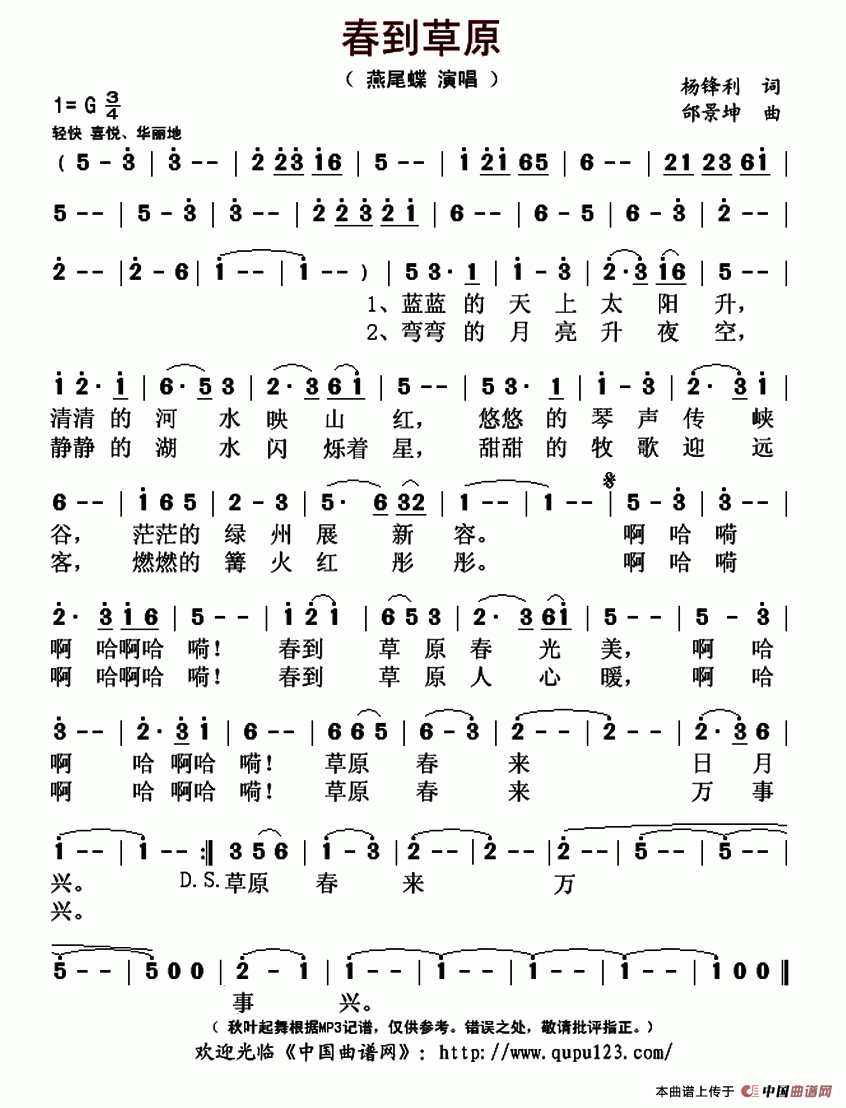 邰景坤曲谱推荐心中的草原(张明金词 邰景坤曲)醉美草原(叶舞霓裳词 邰景坤曲)蒙东电力人阿尔山之恋(敖玉凤词 邰景坤曲)陪你去看草原海草原的母亲河(蔡丽双词 邰景坤曲)忘不了那片草原相约草原(张一凡词 邰景坤曲)大雁回故乡多彩的草原(东方明亮词 邰景坤曲)故乡的绿草地奶茶情(李永章词 邰景坤曲)情漫草原最美的望乡清新的草原回报父母(老兵老歌词 邰景坤曲)我爱草原美丽的萨拉乌苏河人生就像一杯酒(周志平词 邰景坤曲)记住我的心