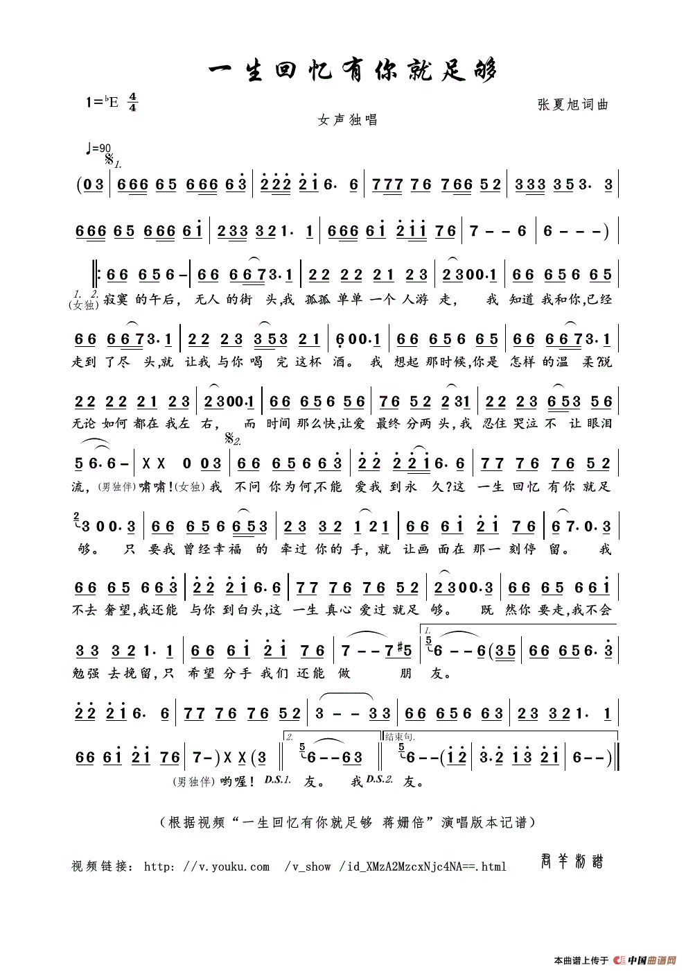 一生回忆有你就足够(张夏旭词曲)相关五线谱