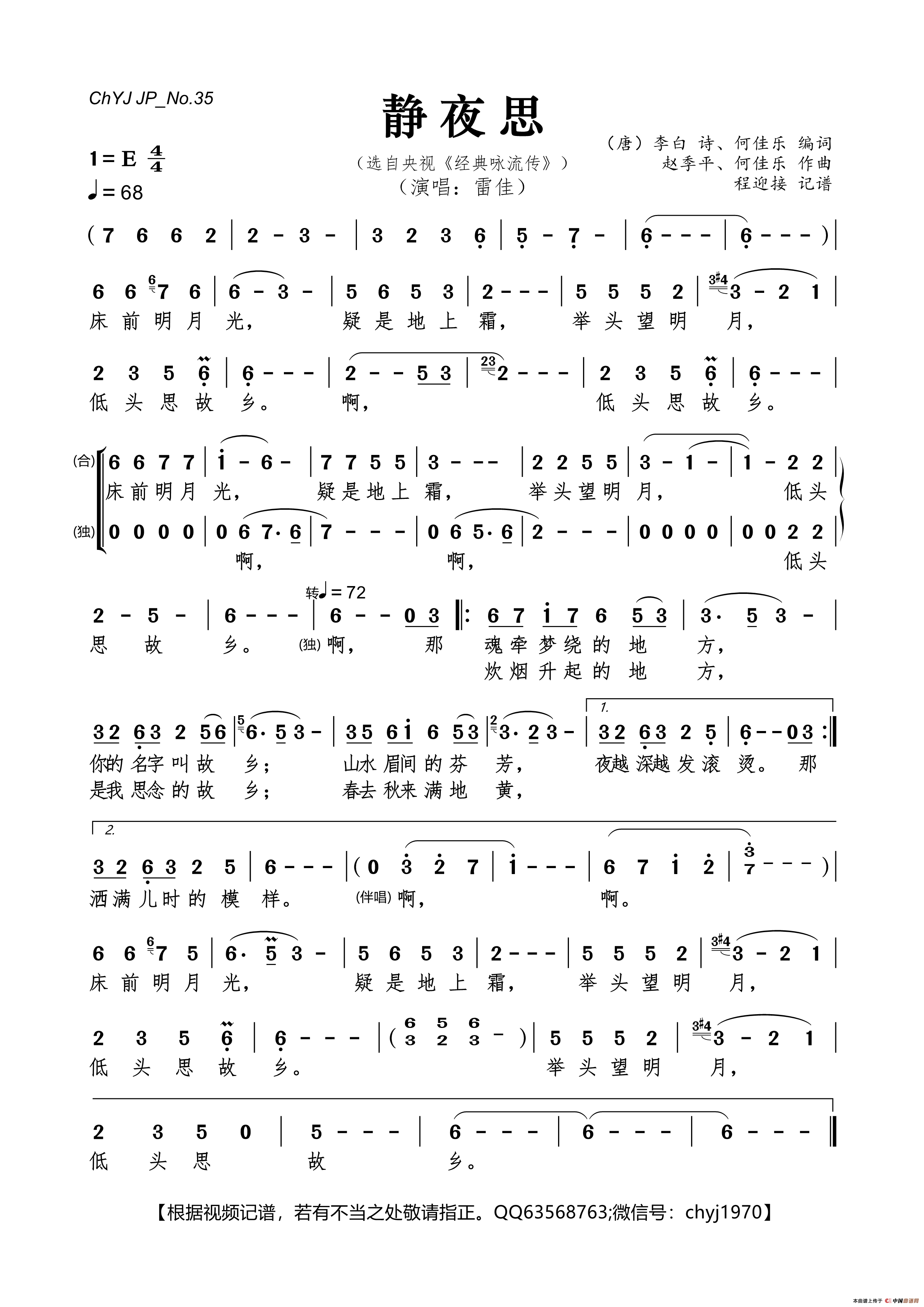 静夜思(选自央视《经典咏流传》)相关五线谱