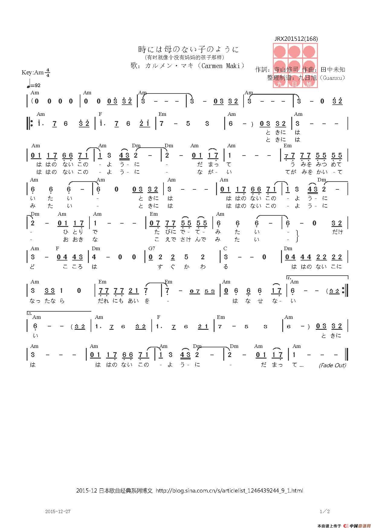 【日】時には母のない子のように(有时就像个没有妈妈的孩子那样)相关五线谱