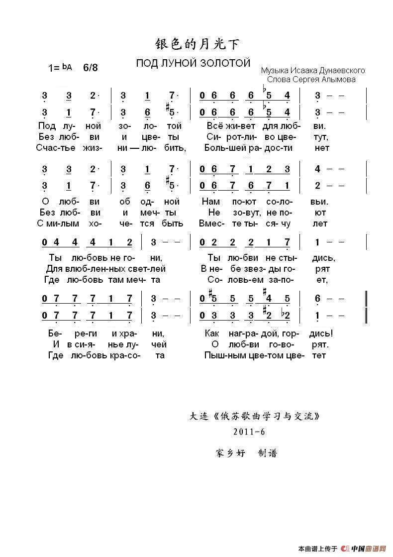 银色的月光下ПОД ЛУНОЙ ЗОЛОТОЙ(中俄简谱)相关五线谱