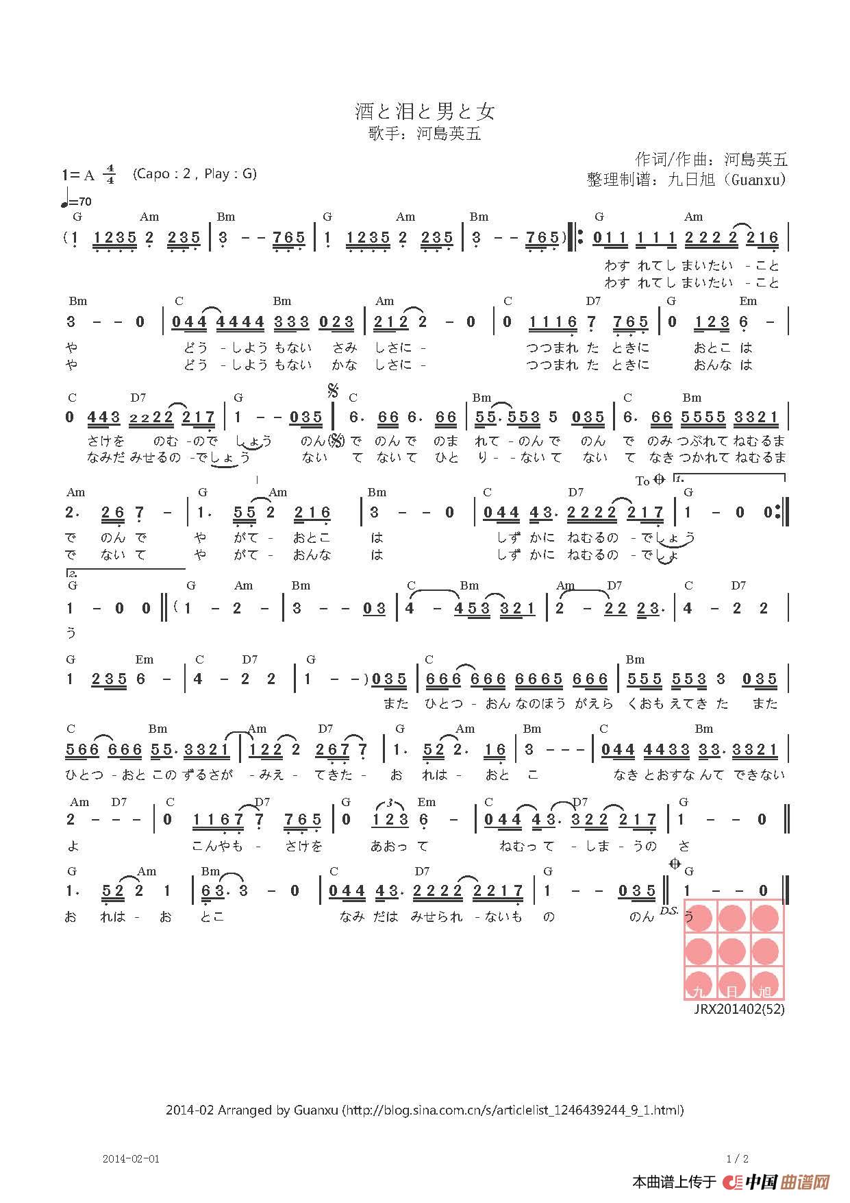 【日】酒と泪と男と女(男人酒女人泪)相关五线谱