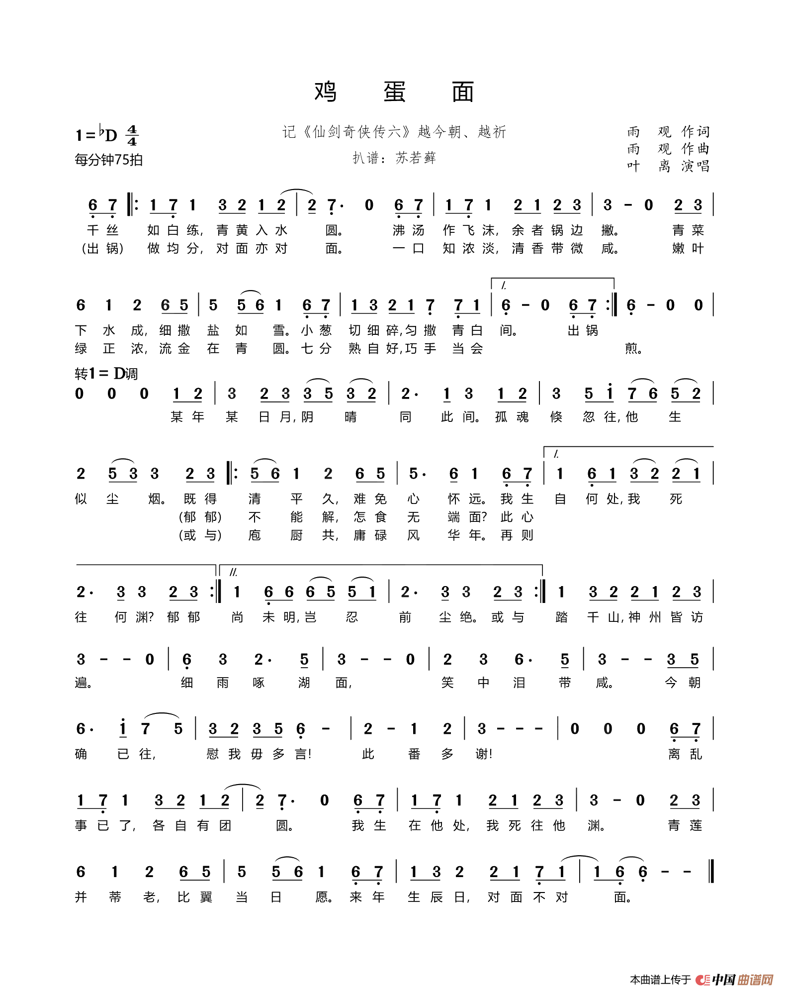 鸡蛋面(记《仙剑奇侠传六》越今朝、越祈)相关五线谱