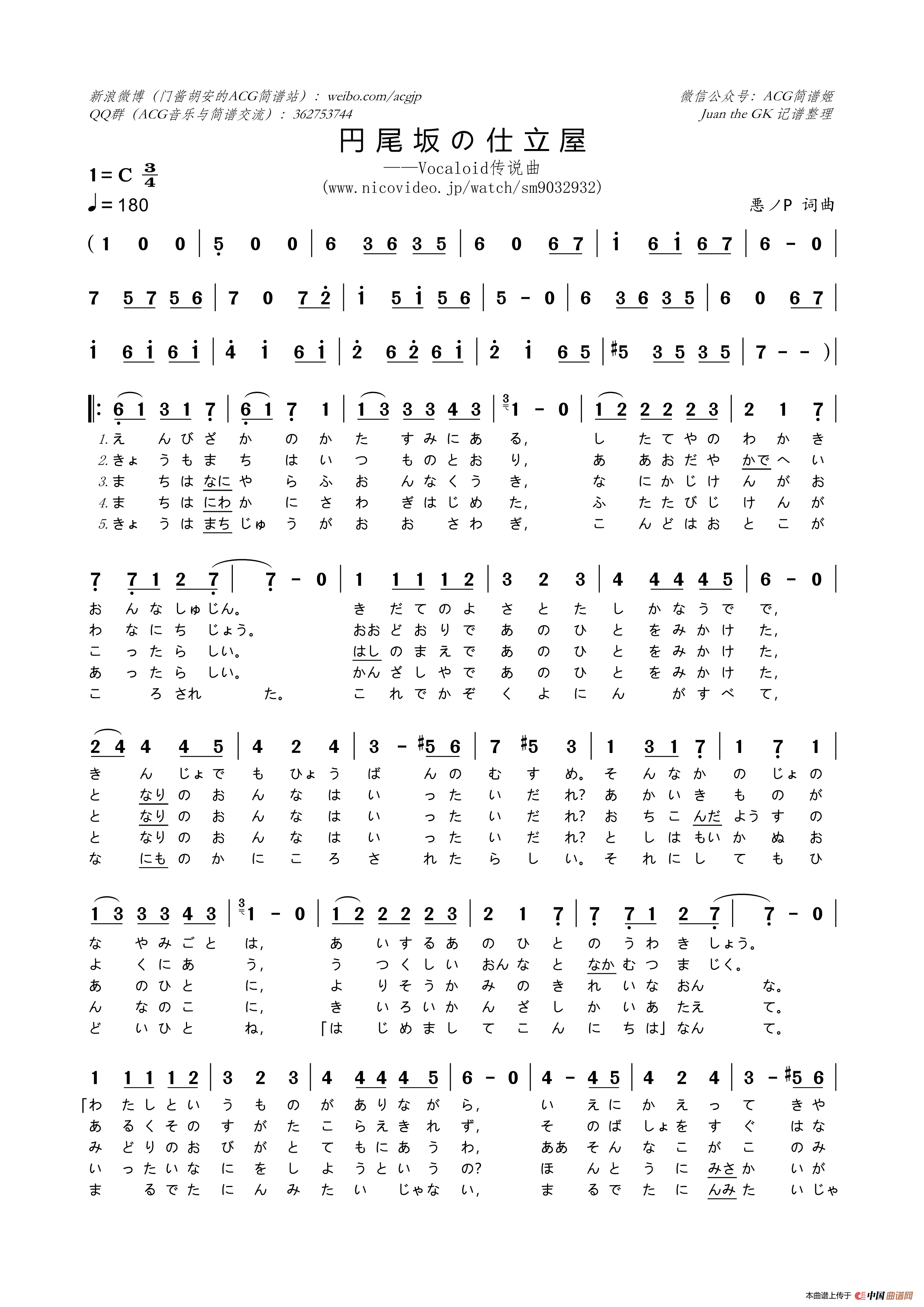 [日]円尾坂の仕立屋(Vocaloid传说曲)相关五线谱