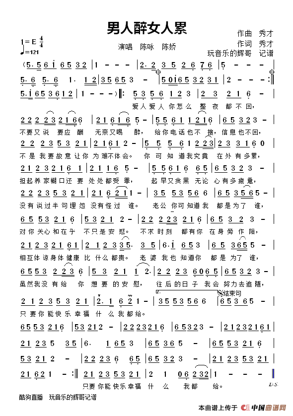 男人醉女人累(陈咏 陈娇)相关五线谱