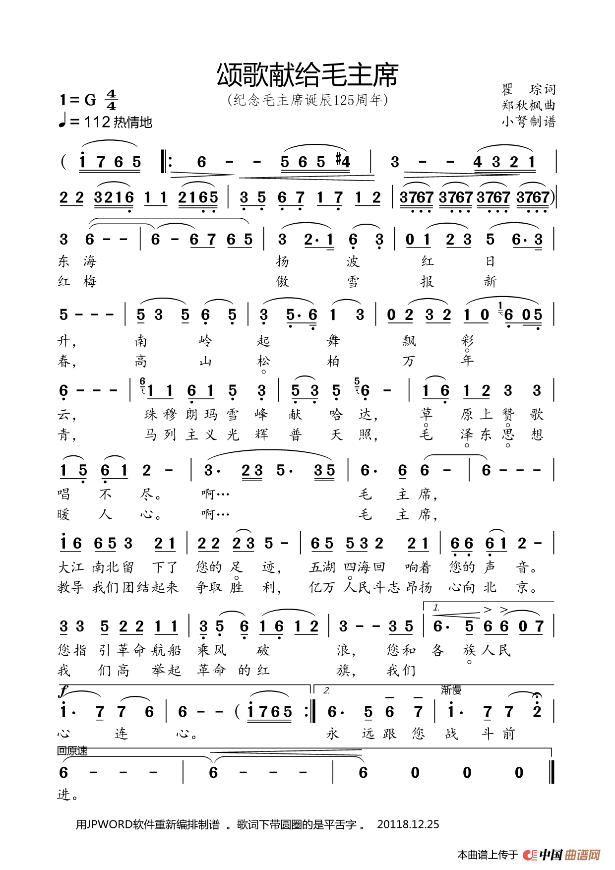 郑秋枫曲谱推荐拖拉机开进苗山寨(女声合唱)帕米尔,我的家乡多么美(声乐组曲《祖国四季》之三)(正谱)我爱你中国(电影《海外赤子》插曲)苦甜歌(献给创业者们)你爱你,中国天海放生歌可爱的蓝精灵(动画片《蓝精灵》主题歌)请别这样看我美丽的孔雀河(正谱)大干社会主义最光荣珍珠河(岑桑词 郑秋枫曲)祖国啊,台湾儿女的母亲思乡曲(大字老人适用)十月里响起一声春雷我爱你中国〔梦之旅合唱组合〕( 男女三声部重唱)我爱你,中国我爱梅园梅飞向无限向往的明天我望着老师的眼睛(佚名词 郑秋枫曲)我爱你,中国(默涵制谱版)