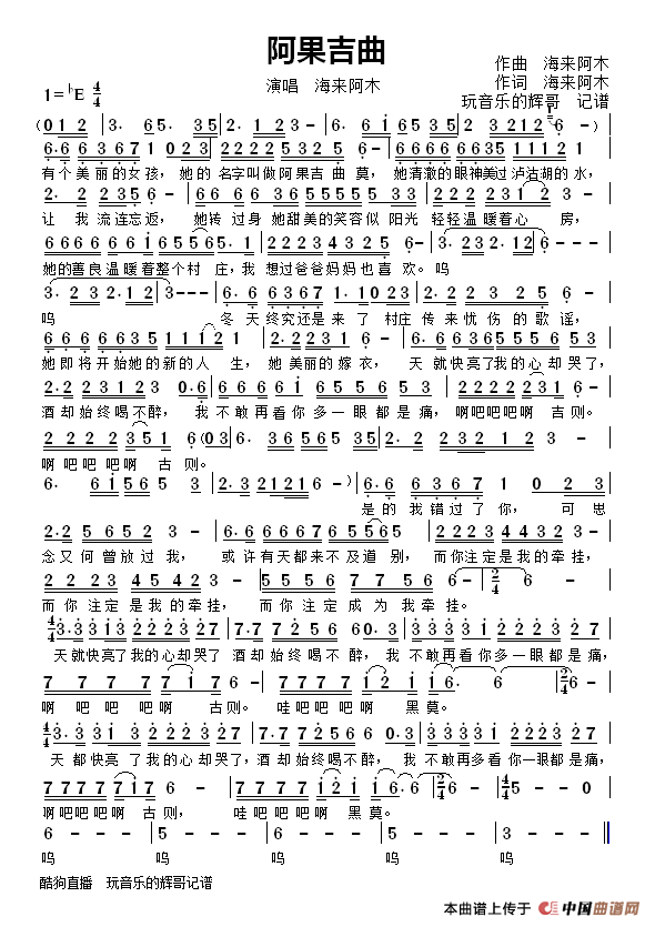 根据海来阿木演唱记谱