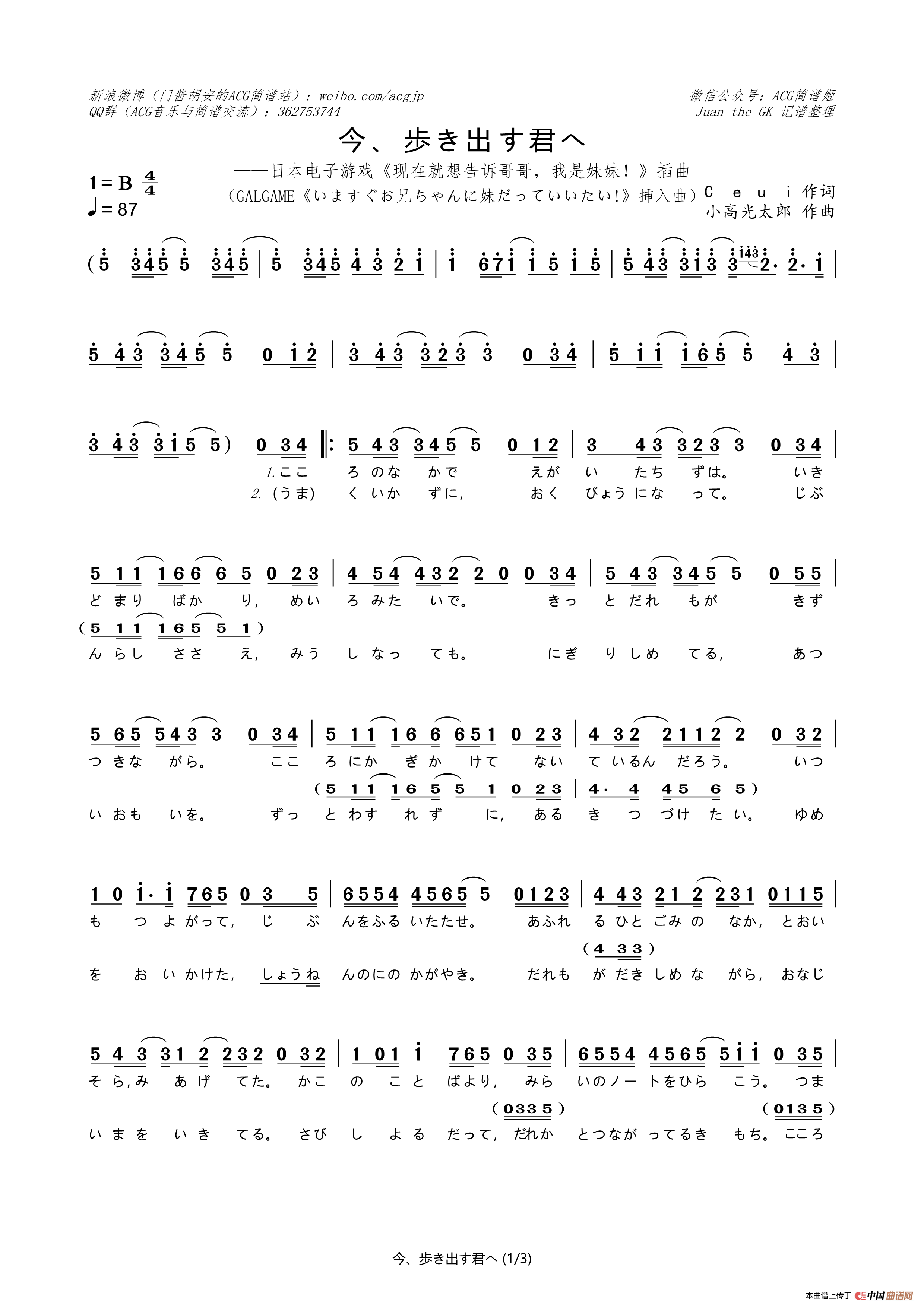 [日]今、歩き出す君へ(游戏《现在就想告诉哥哥,我是妹妹!》插曲)相关五线谱