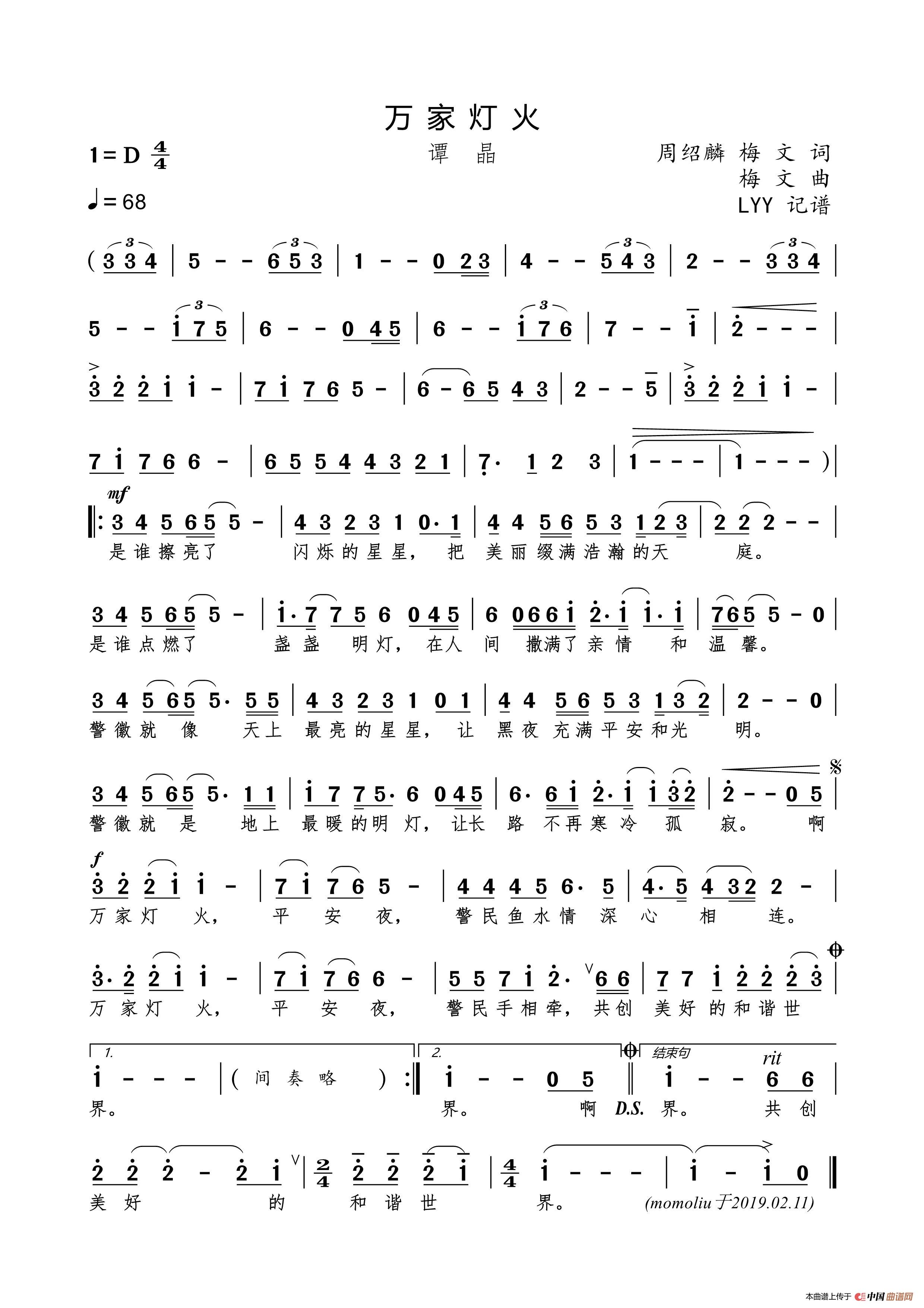 万家灯火(周绍麟 梅文词 梅文曲)相关五线谱