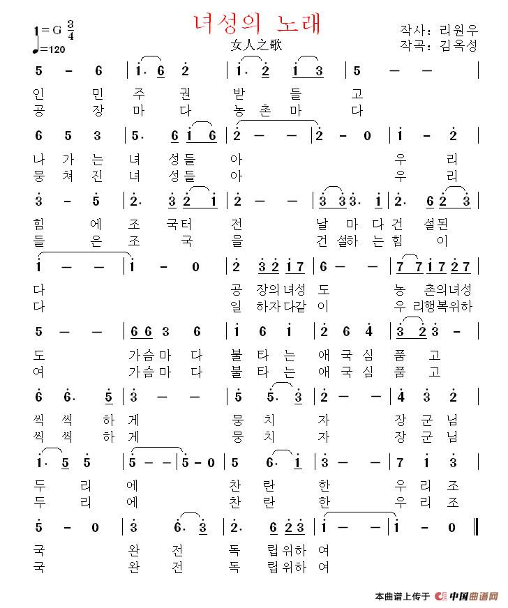 [朝鲜]녀성의 노래(女人之歌)相关五线谱