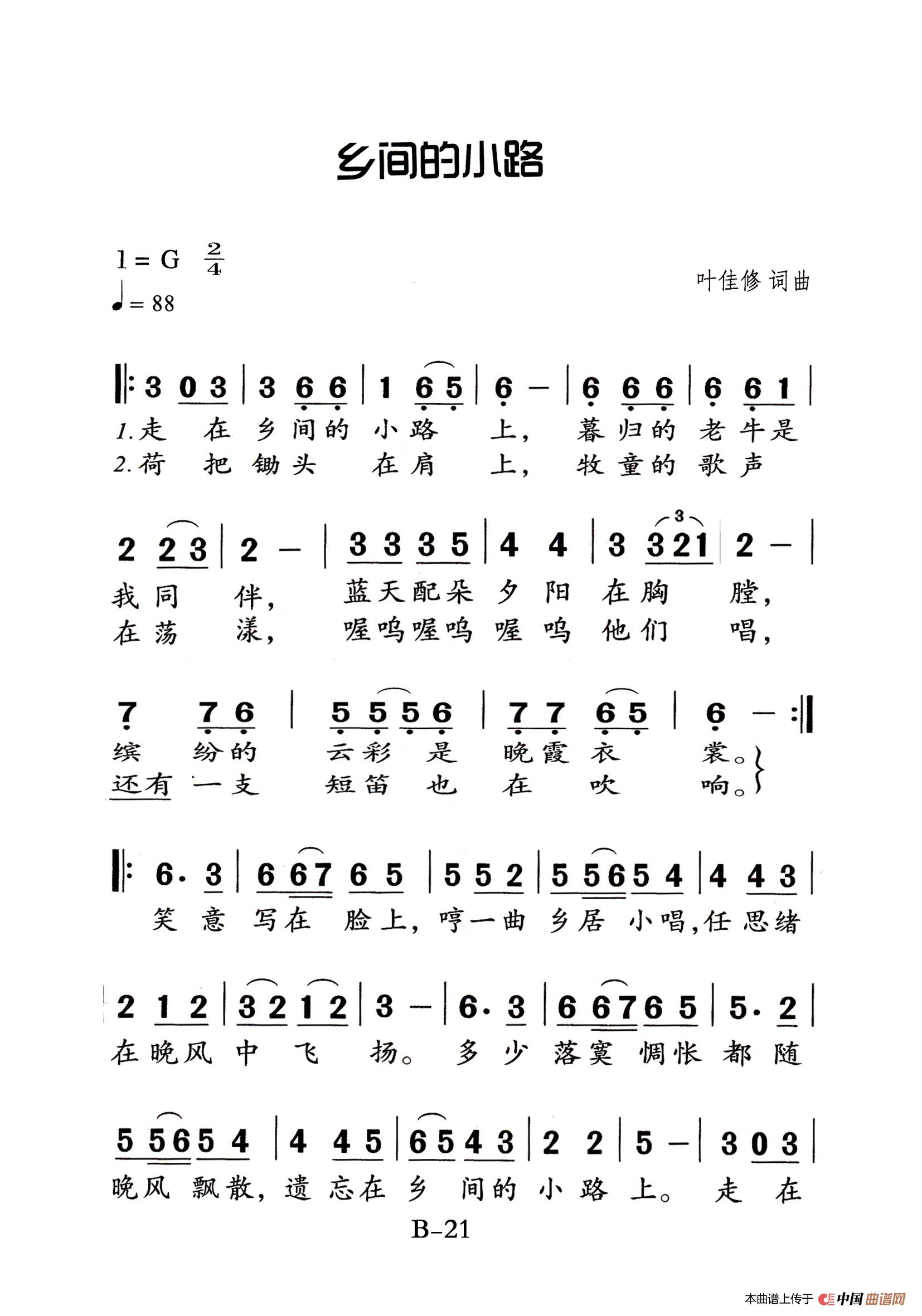 叶佳修曲谱推荐外婆的澎湖湾走在乡间的小路上(钢琴弹唱、荆乐霞编配版)外婆的澎湖湾(线简混排弹唱谱)乡间的小路外婆的澎湖湾(林华编合唱版)外婆的澎湖湾(架子鼓、简谱+鼓谱)爸爸的草鞋(东方神秘园组合)我们拥有一个名字——中国外婆的澎湖湾(线、简谱混排版)我们拥有一个名字叫——中国爸爸的草鞋(线简混排弹唱谱)乡间的小路乡间小路外婆的澎湖湾(弹唱谱)路(张继良词 叶佳修曲)外婆的澎湖湾乡间的小路(弹唱谱)乡间的小路年轻人的心声(台湾电影《年轻人的心声》主题歌)外婆的澎湖湾(钟维国编合唱版)