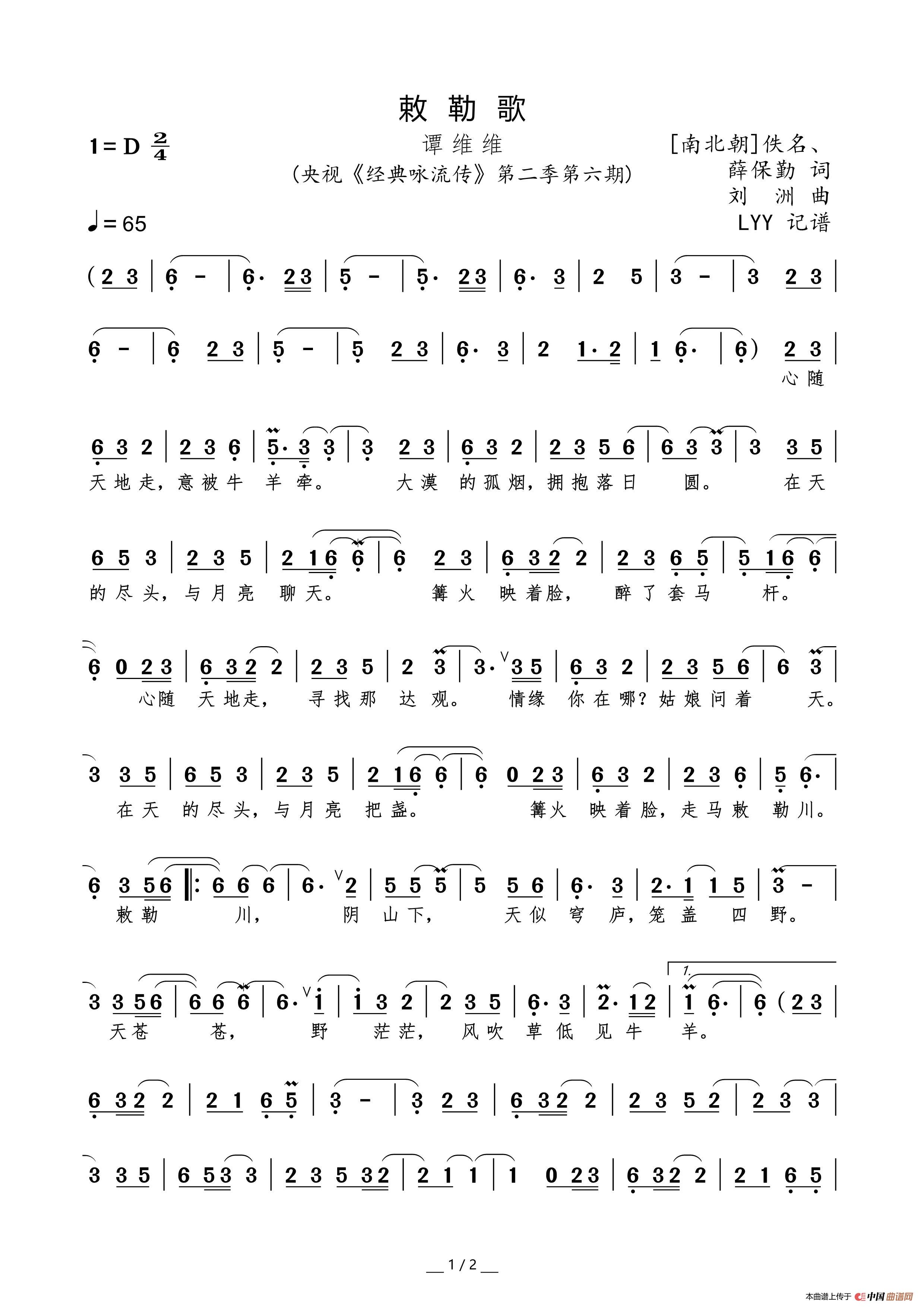 敕勒歌([南北朝]佚名、薛保勤词 刘洲曲)相关五线谱