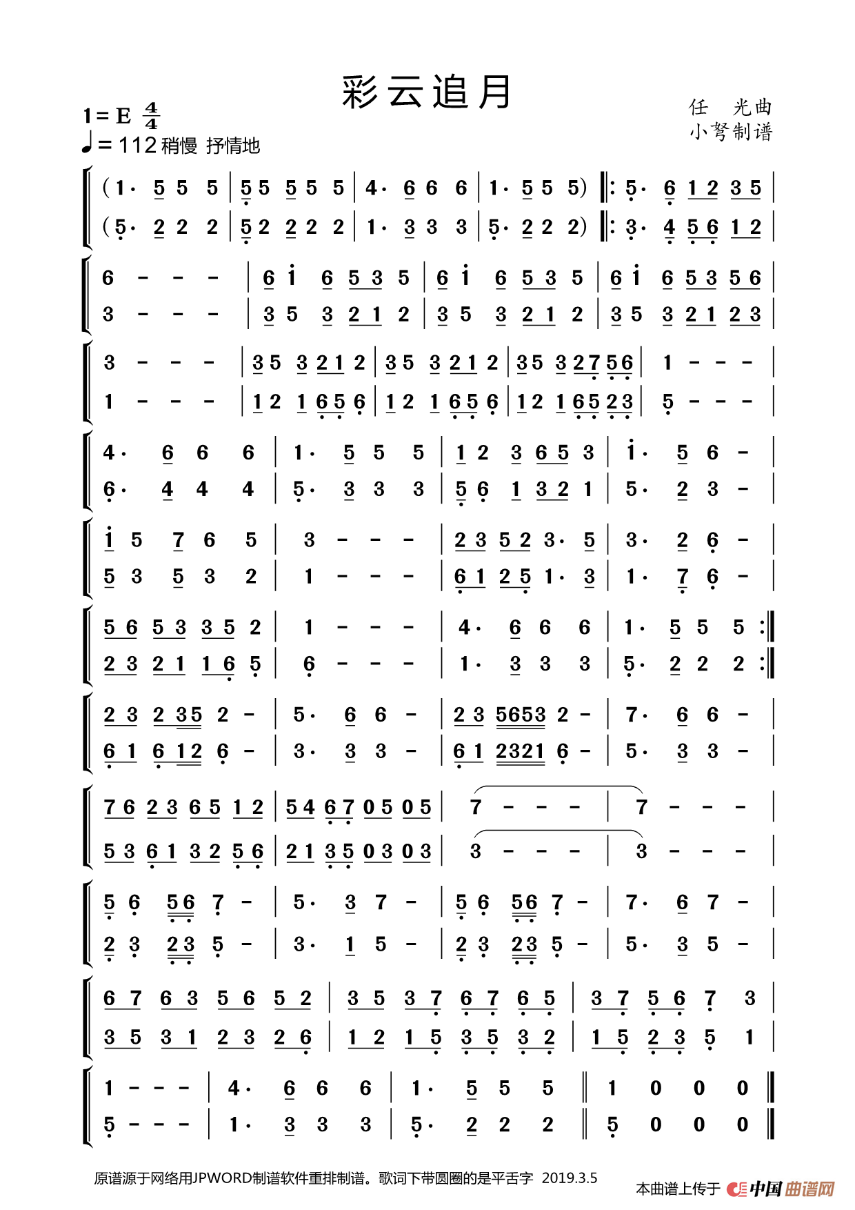 任光曲谱推荐彩云追月(广东音乐)丁小琴编-11渔光曲(正谱)彩云追月(箫、琵琶二重奏)渔村之歌(电影《渔光曲》插曲)彩云追月渔光曲(同名电影插曲)落叶(安娥词 任光曲)采蚌歌几度花落时大地行军曲(电影《空谷兰》插曲)高粱叶(歌剧《洪波曲》选曲之二)彩云追月(葫芦丝二重奏曲谱)红尘(佚名词 任光曲)凯歌(同名电影主题歌)渔光曲彩云追月(笛子初级乐曲)彩云追月(广东民乐)彩云追月柳琴考级曲目二级:彩云追月抗敌歌(故事影片《空谷兰》选用)