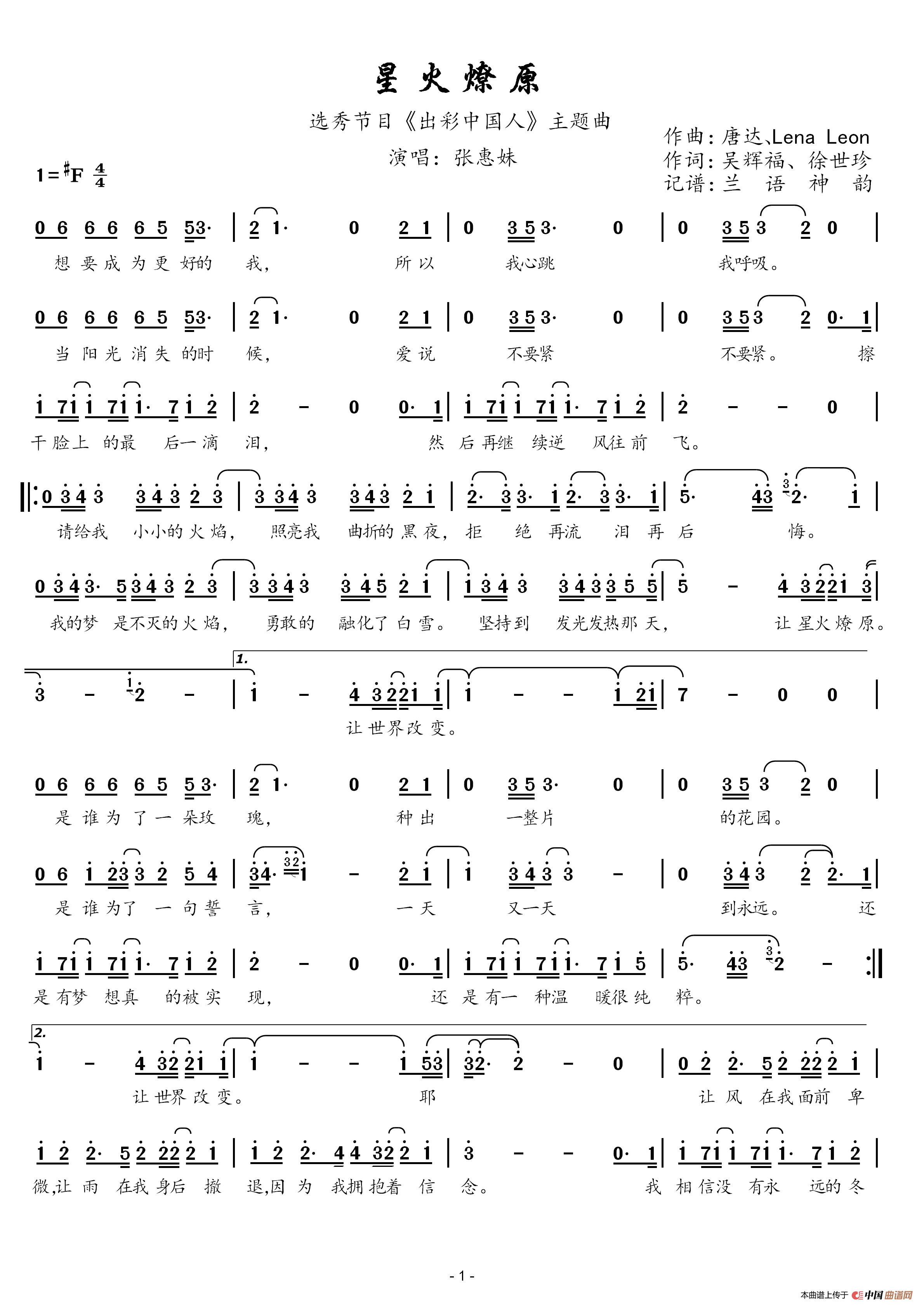 星火燎原(选秀节目《出彩中国人》主题曲)相关五线谱