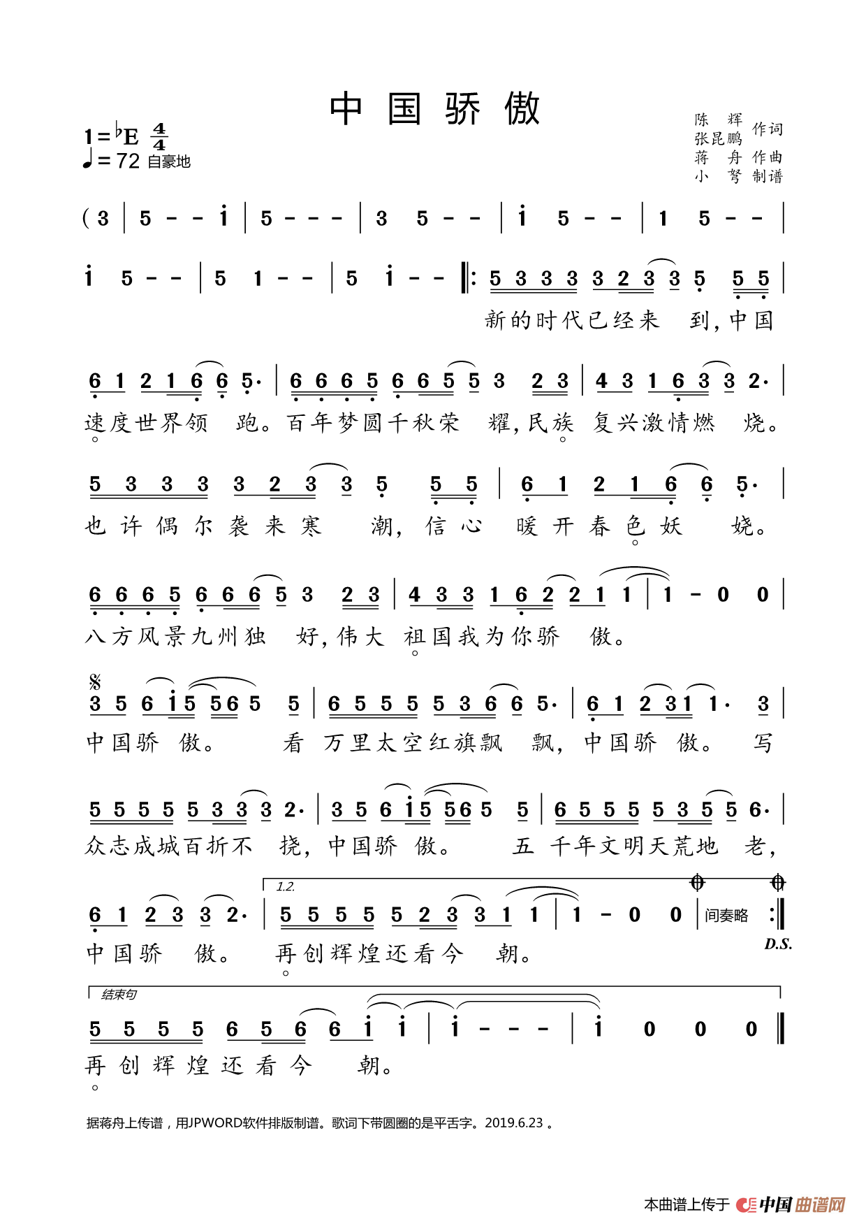 蒋舟曲谱推荐红红的日子(火山词 蒋舟、国强曲、线简谱混排版)中国梦中国福尚锦之歌爱我人民爱我军(亦弛记谱)新日鲜之歌红红的日子(火山、萃萃词 蒋舟曲)今年花开永远的长征(赵世欣词 蒋舟曲)识字班(大型交响声乐套曲《沂蒙红崖》选曲)团圆中国年祖国,我永远爱你(樊孝斌词 蒋舟曲)劲旅雄风赛茶歌天南海北四川人山河听我说今天这里晴到少云青春无悔(云剑词 蒋舟曲)美滋滋(李俊伟词 蒋舟曲)穿上军装的那一天(军旅歌曲100首)幸福海洋