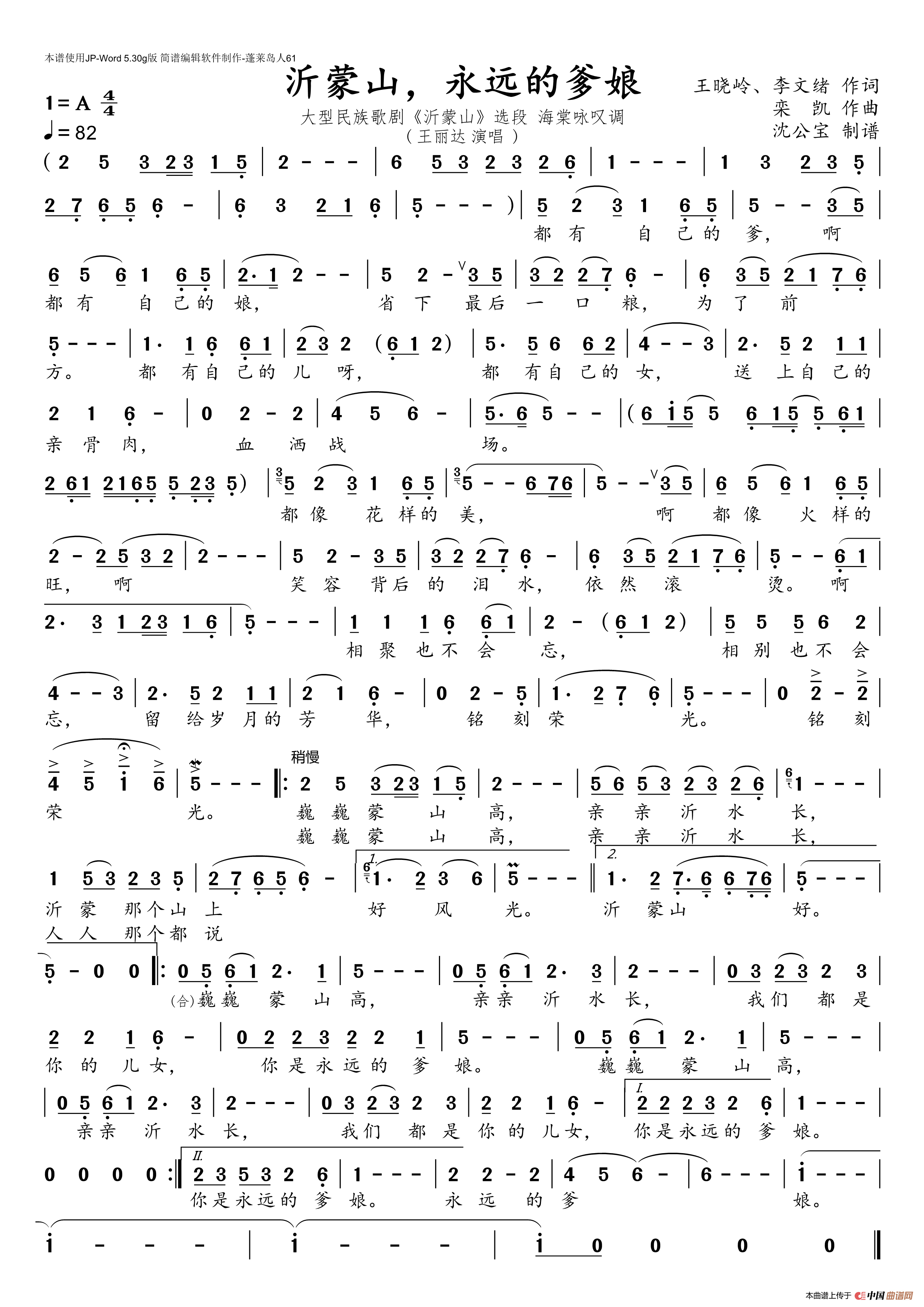 沂蒙山永远的爹娘相关五线谱
