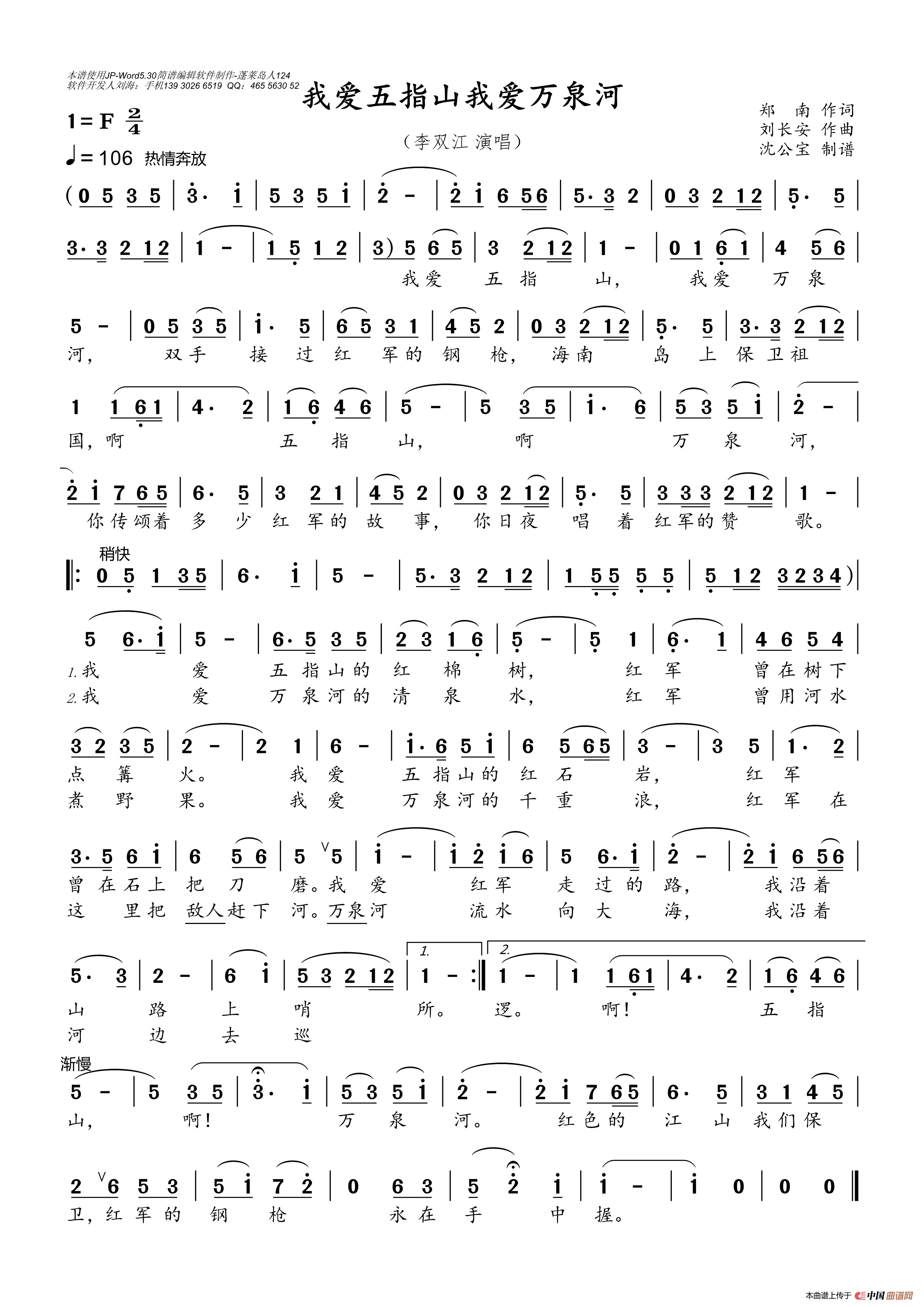 刘长安曲谱推荐万代歌颂毛主席苗家永向红太阳苦练春秋青出蓝(故事片《新方世玉》主题歌)我爱五指山我爱万泉河我爱五指山 我爱万泉河(李双江演唱)我爱五指山我爱万泉河我爱五指山我爱万泉河(老人适用)温泉日月流祖国,东方的骏马学大庆 创大业温泉日夜流 郑南词(女声小合唱)四美的春风遍地吹献给你(赖房千词 刘长安曲)党的光辉照南疆俺是河南人向海洋(宋小明词 刘长安曲)美之歌(陈貌词 刘长安曲)奉献之歌(徐环宙词 刘长安曲)