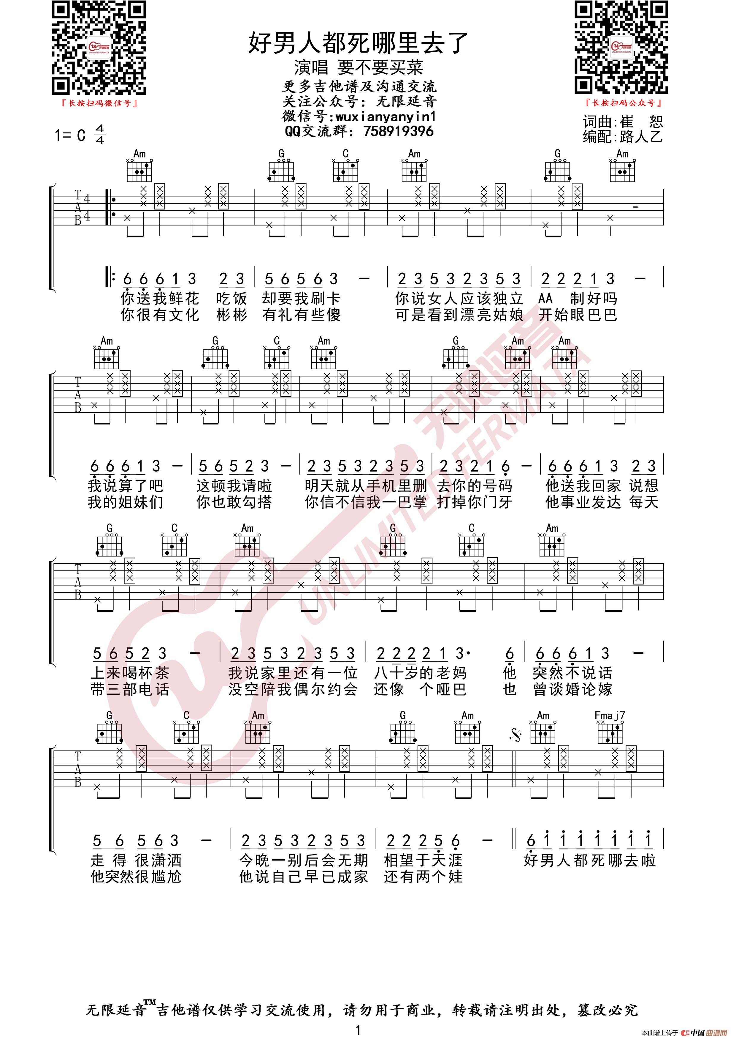 要不要买菜 好男人都死哪里去了 吉他谱(无限延音编配)相关五线谱
