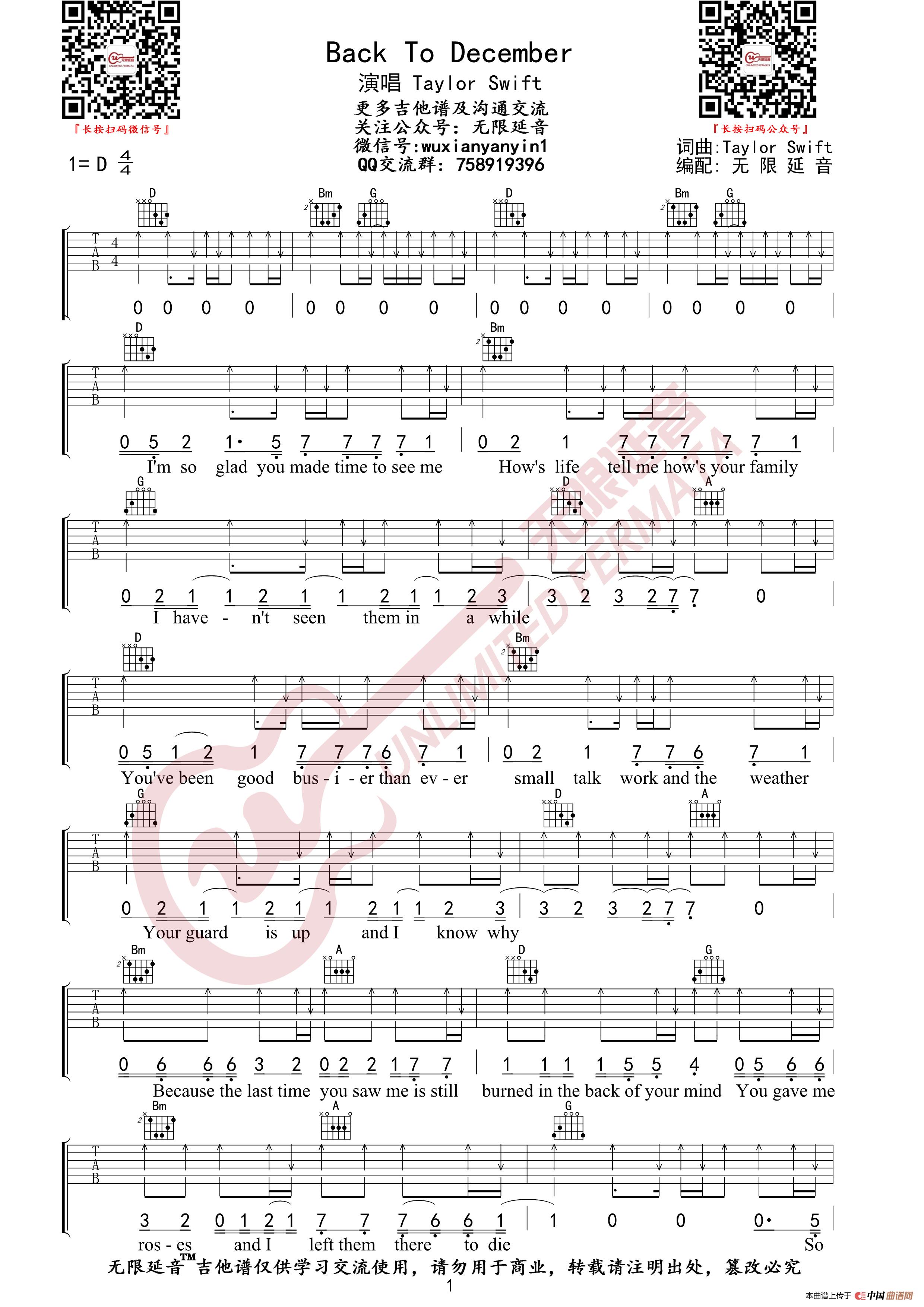 Taylor Swift 泰勒 斯威夫特 Back To December 吉他谱(无限延音编配)