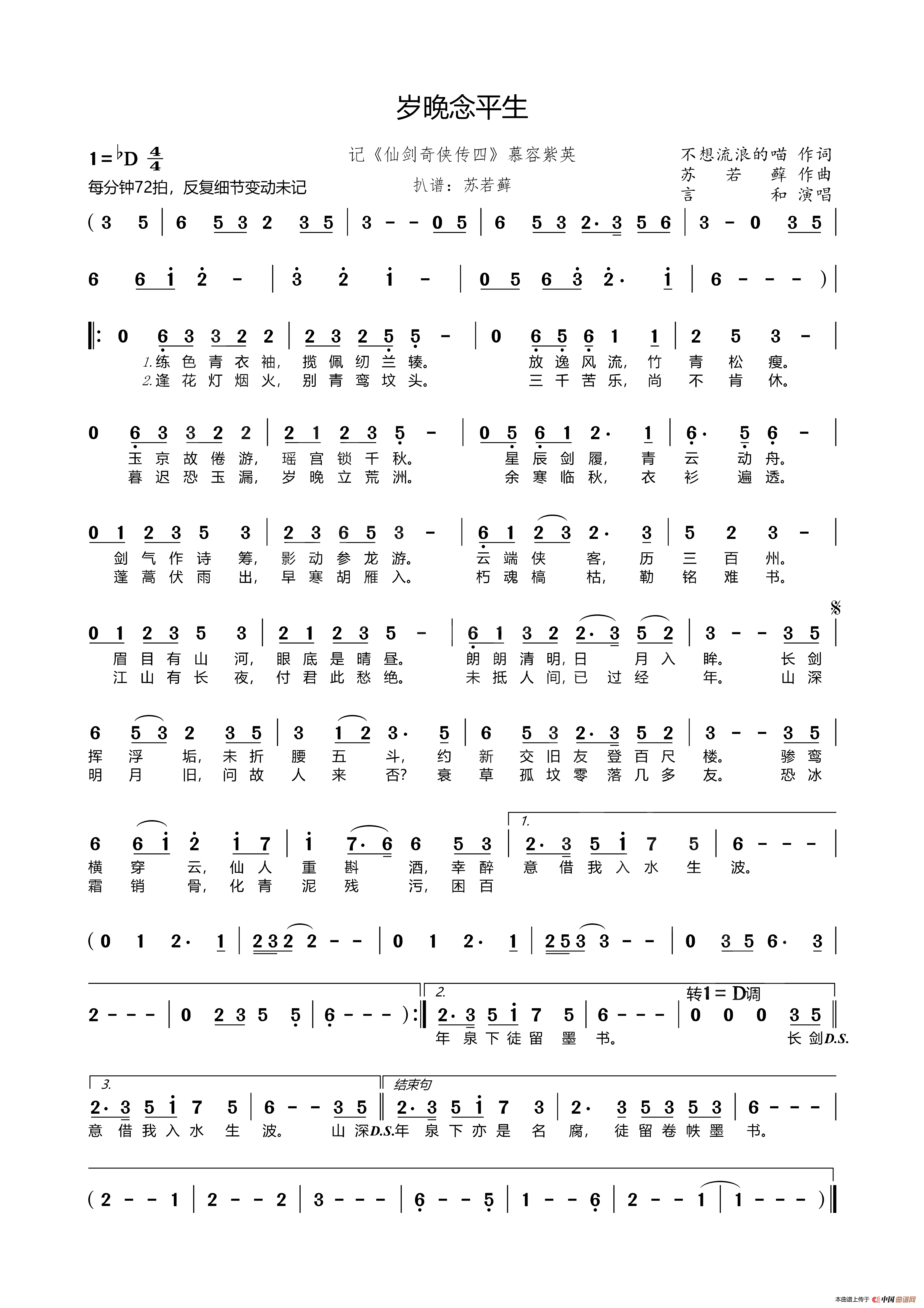 岁晚念平生(记《仙剑奇侠传四》慕容紫英)相关五线谱