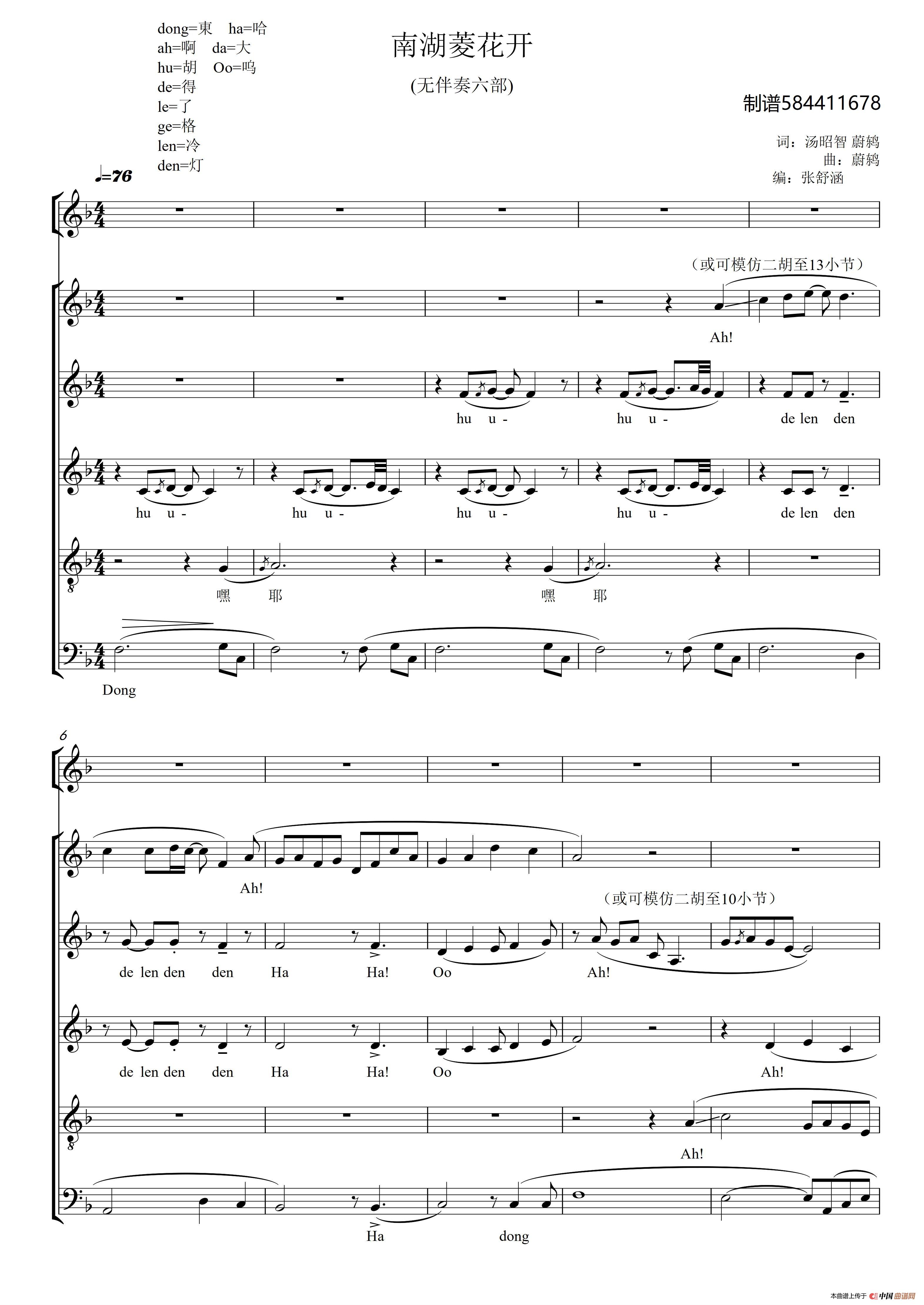 南湖菱花开合唱谱(无伴奏六部)相关五线谱