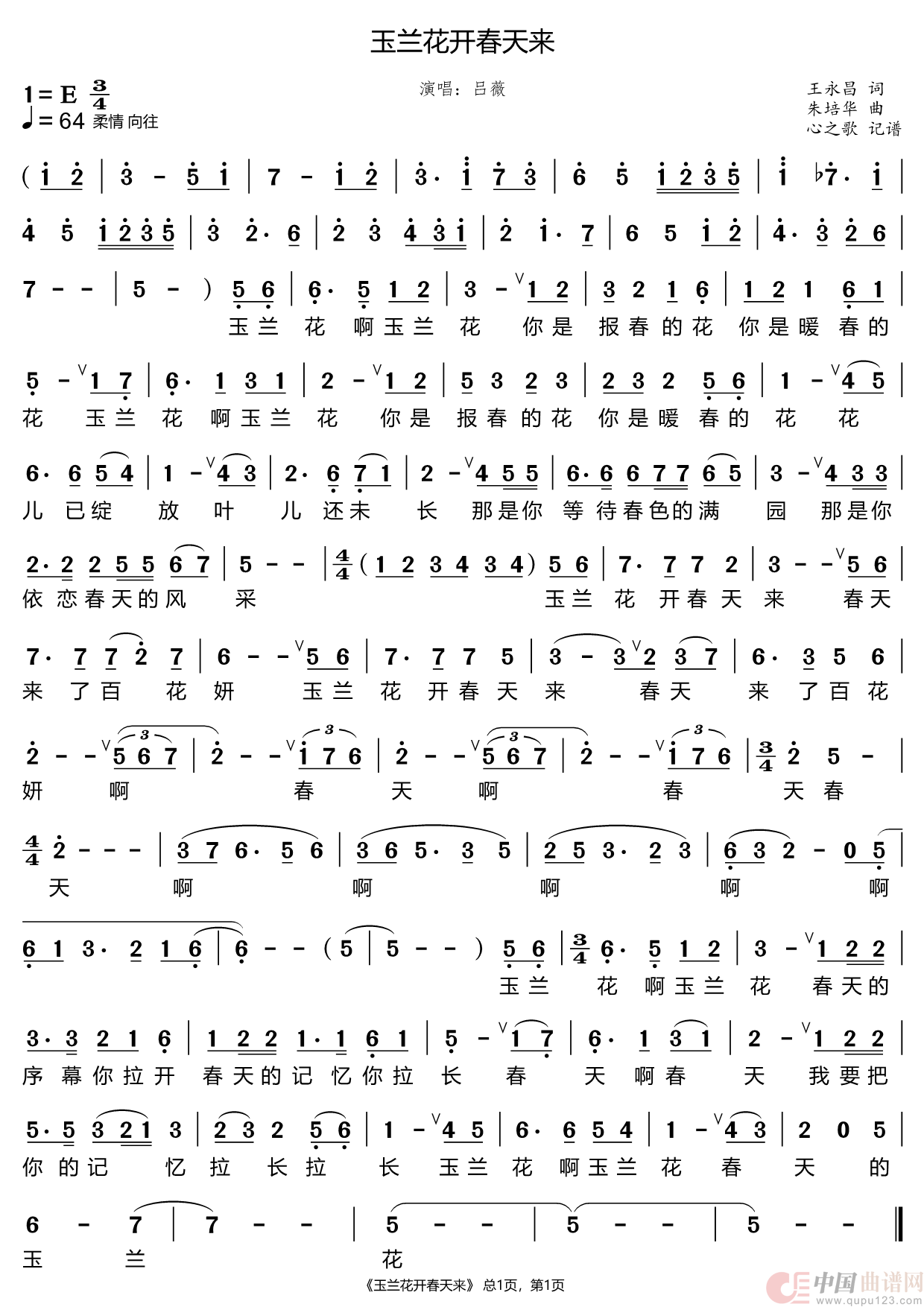 朱培华曲谱推荐你(杨晓光词 朱培华曲)劳动托起中国梦听草原(远山词 朱培华曲)人间天堂楼外楼((电视剧《楼外楼》主题曲))玉兰花开春天来(王永昌词 朱培华曲)青玉案·元夕([南宋]辛弃疾词 朱培华 孙天强曲)故乡的莲乡音永久(庞燕词 朱培华曲)乡音永久丝路彩带(牟学农词 朱培华曲)九月杭州桂花香(2016年G20杭州峰会主题歌)劳动托起中国梦(杨晓光 戴震华词 朱培华曲)