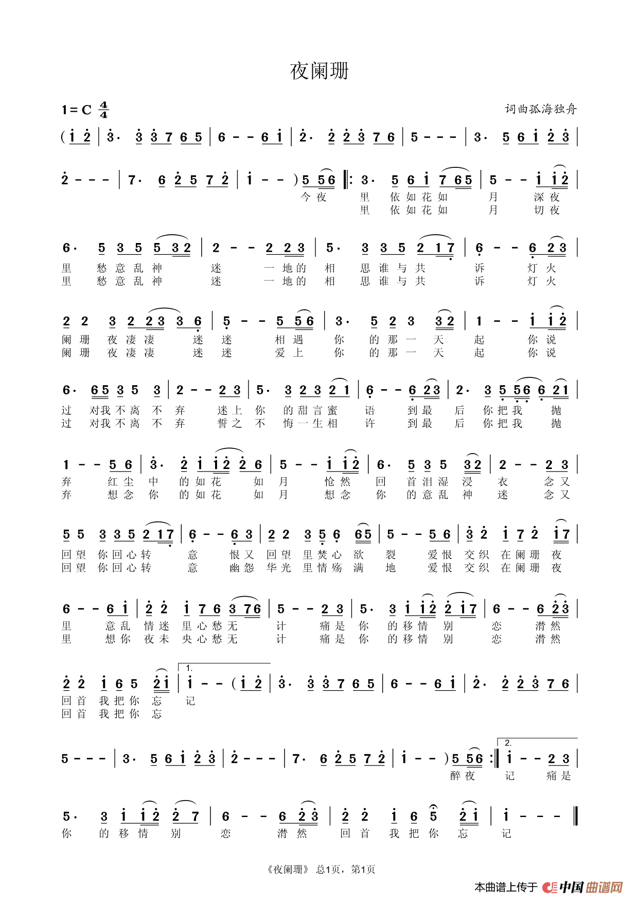 夜阑珊相关五线谱