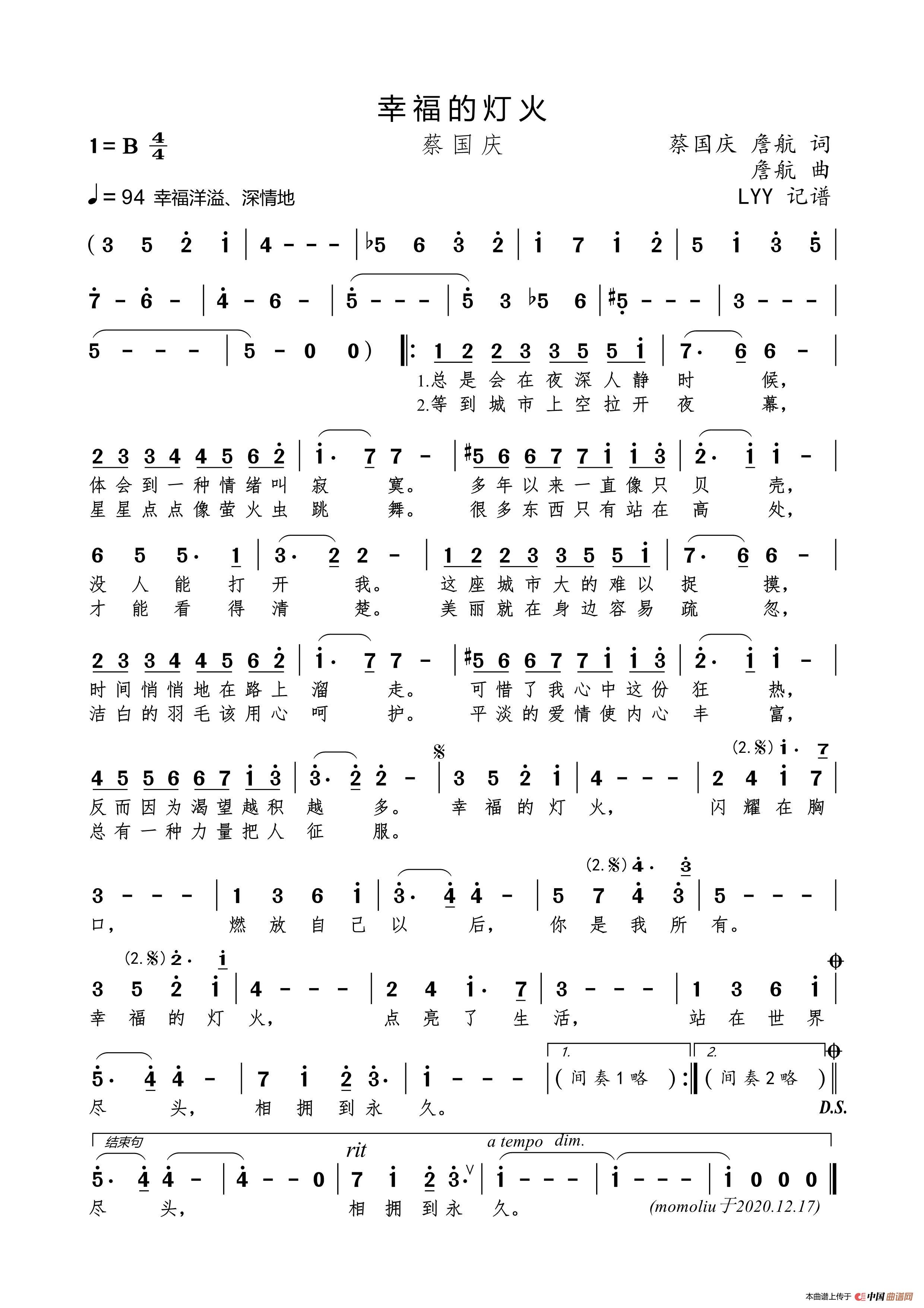 幸福的灯火(蔡国庆/詹航词 詹航曲)相关五线谱