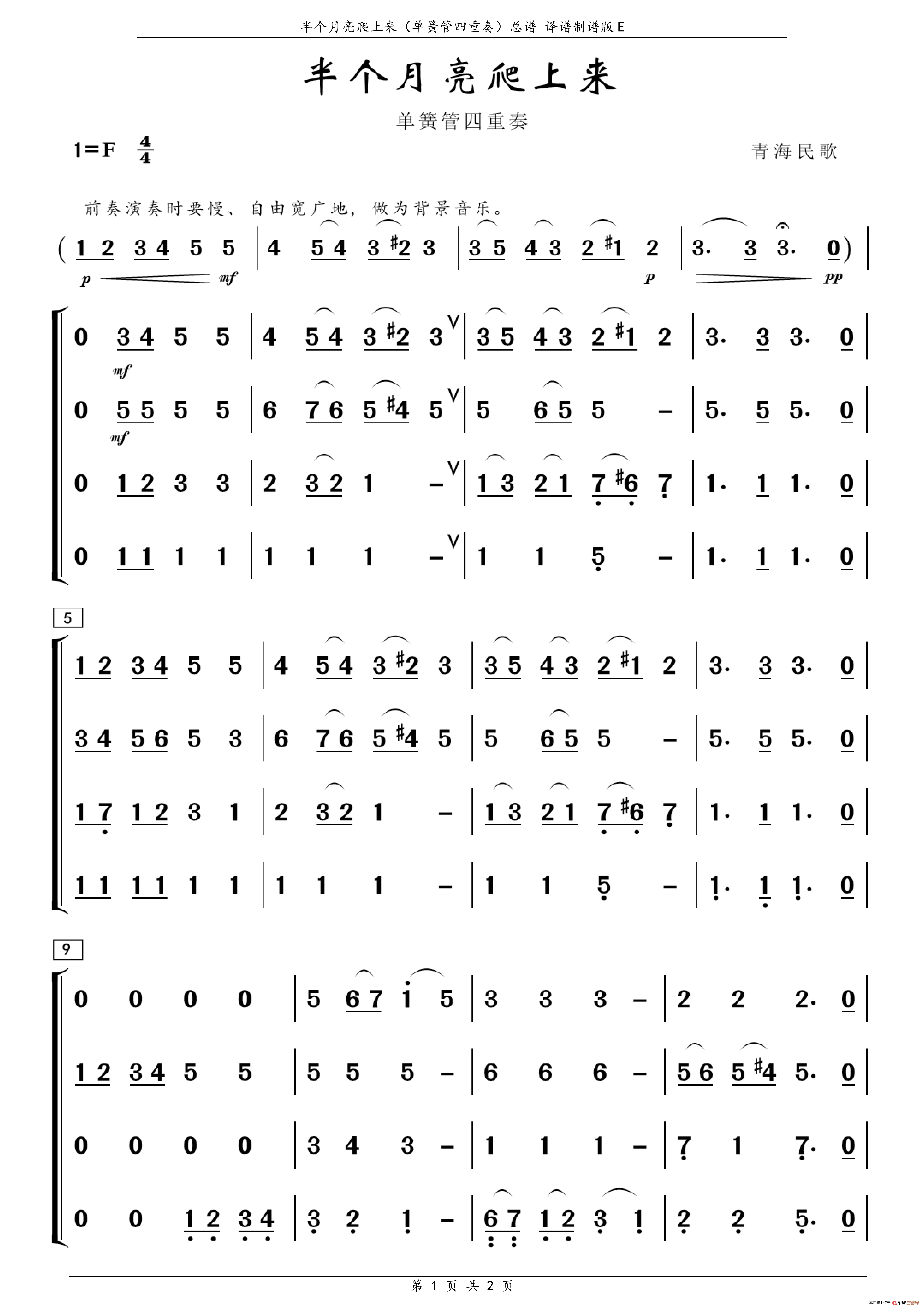 半个月亮爬上来(单簧管四重奏)相关五线谱