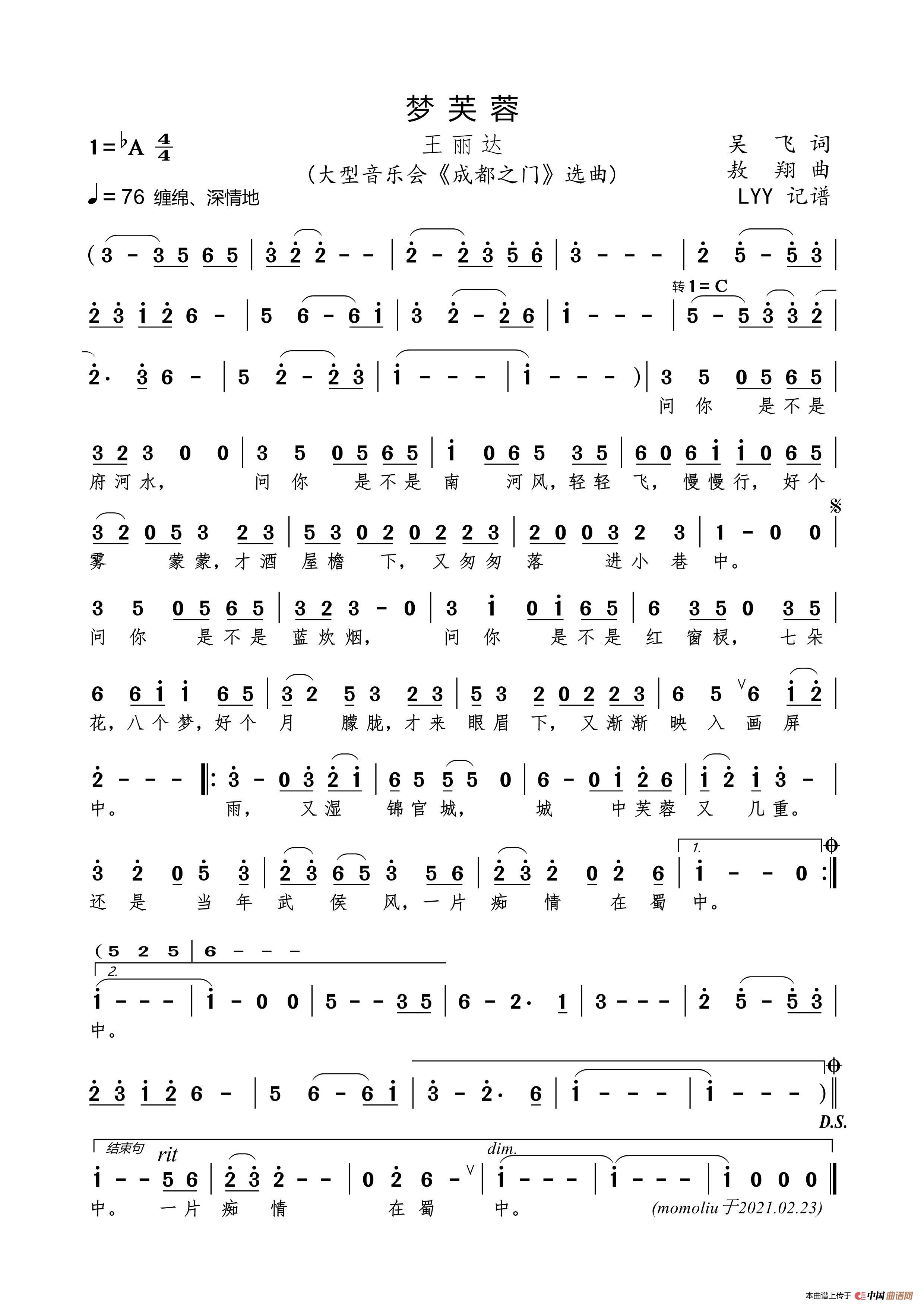 梦芙蓉(吴飞词 敖翔曲)相关五线谱