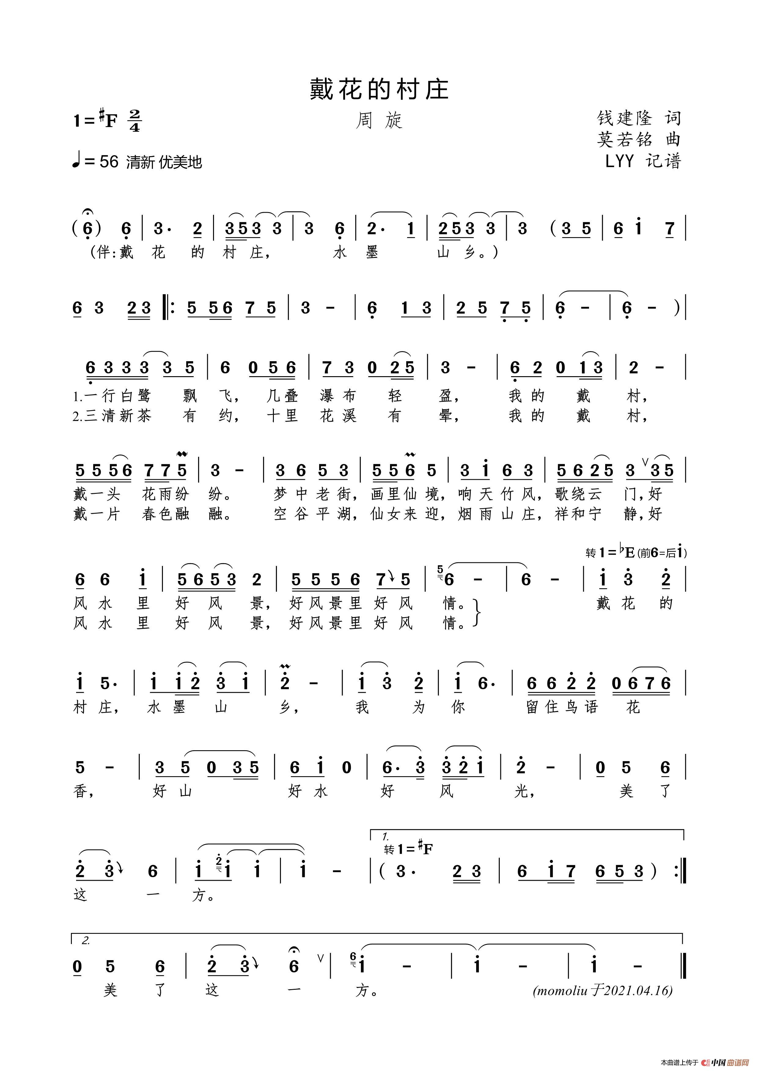 戴花的村庄(钱建隆词 莫若铭曲)相关五线谱