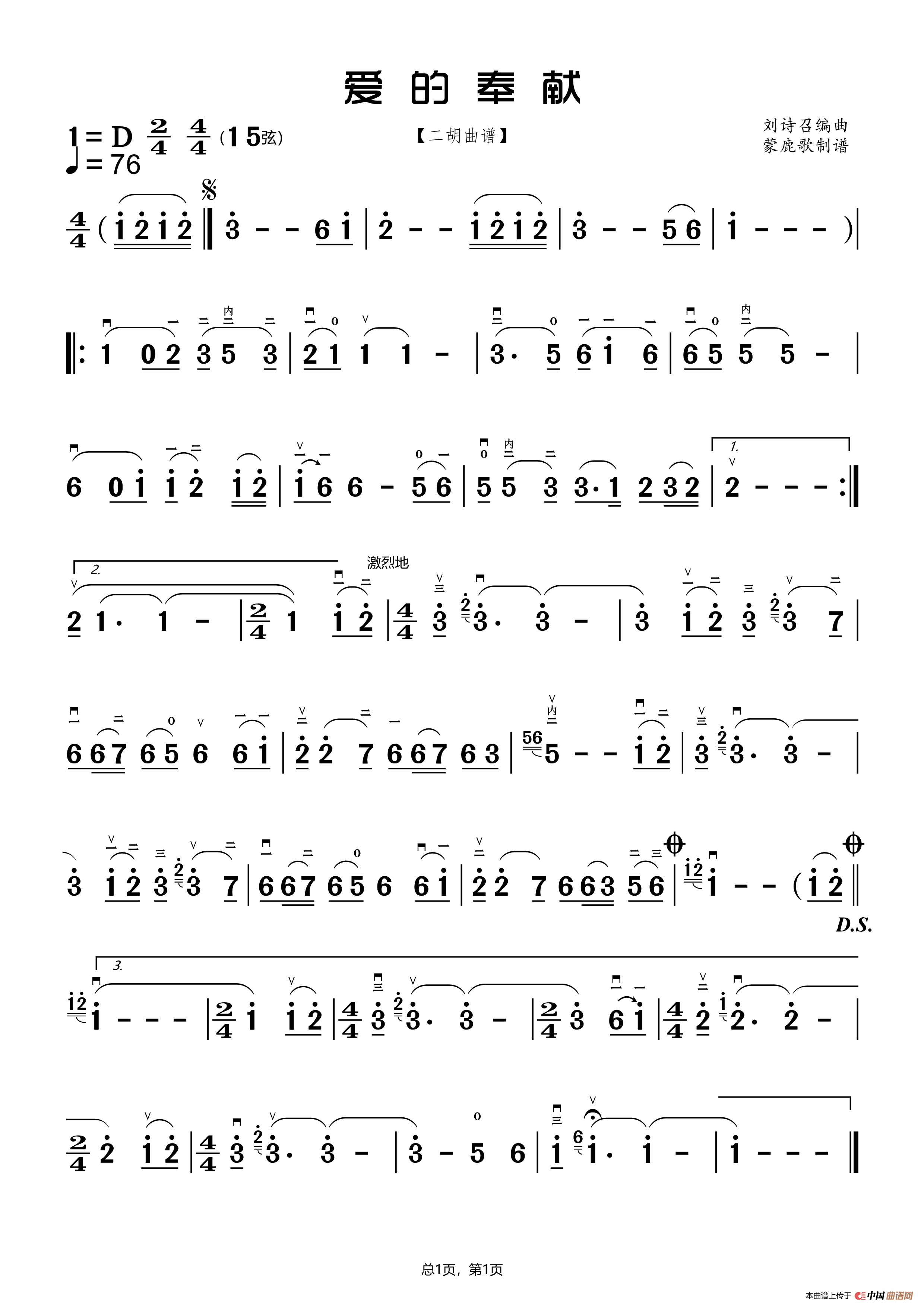 爱的奉献(二胡曲谱)