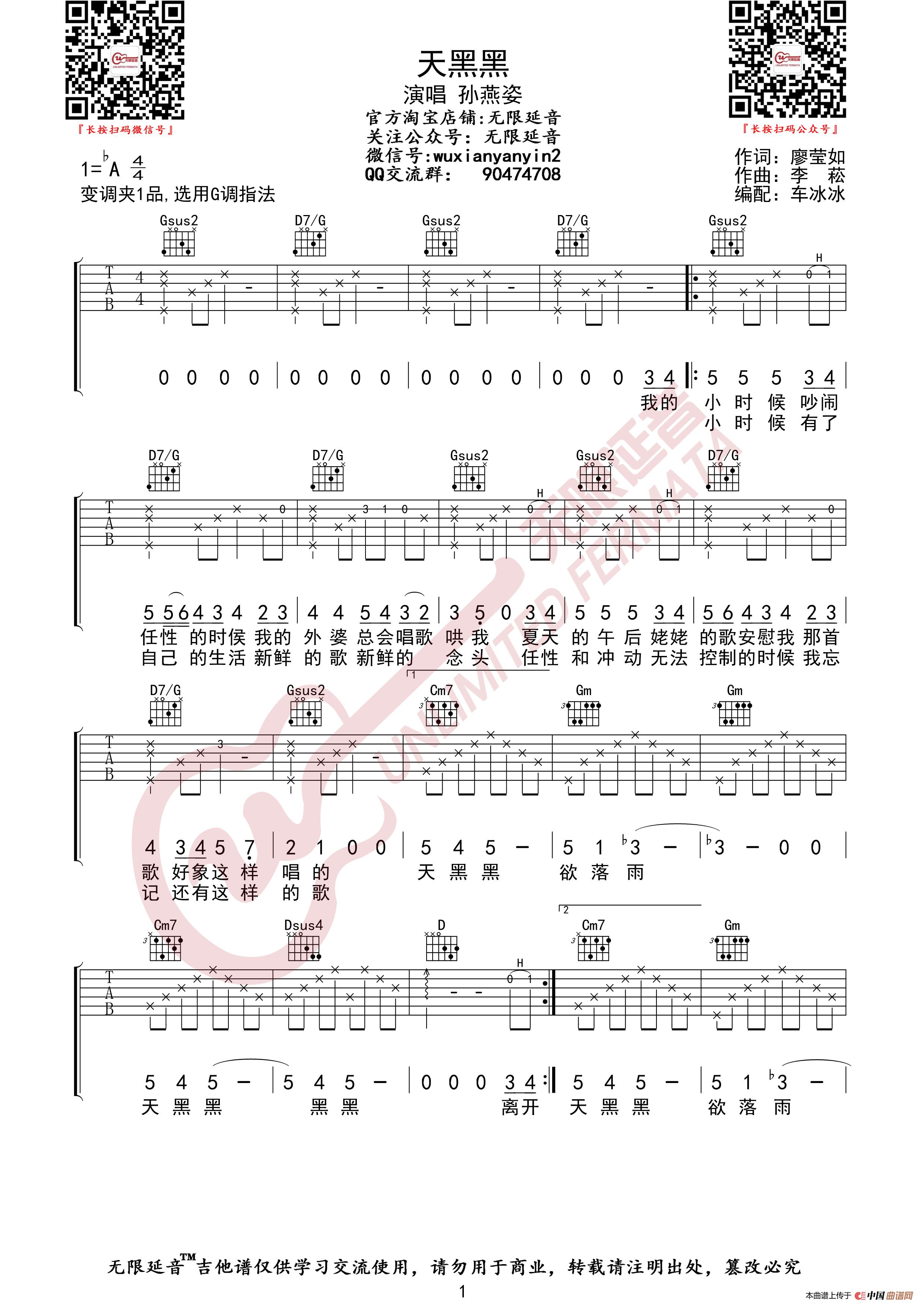 孙燕姿 天黑黑 吉他谱(无限延音编配)相关五线谱
