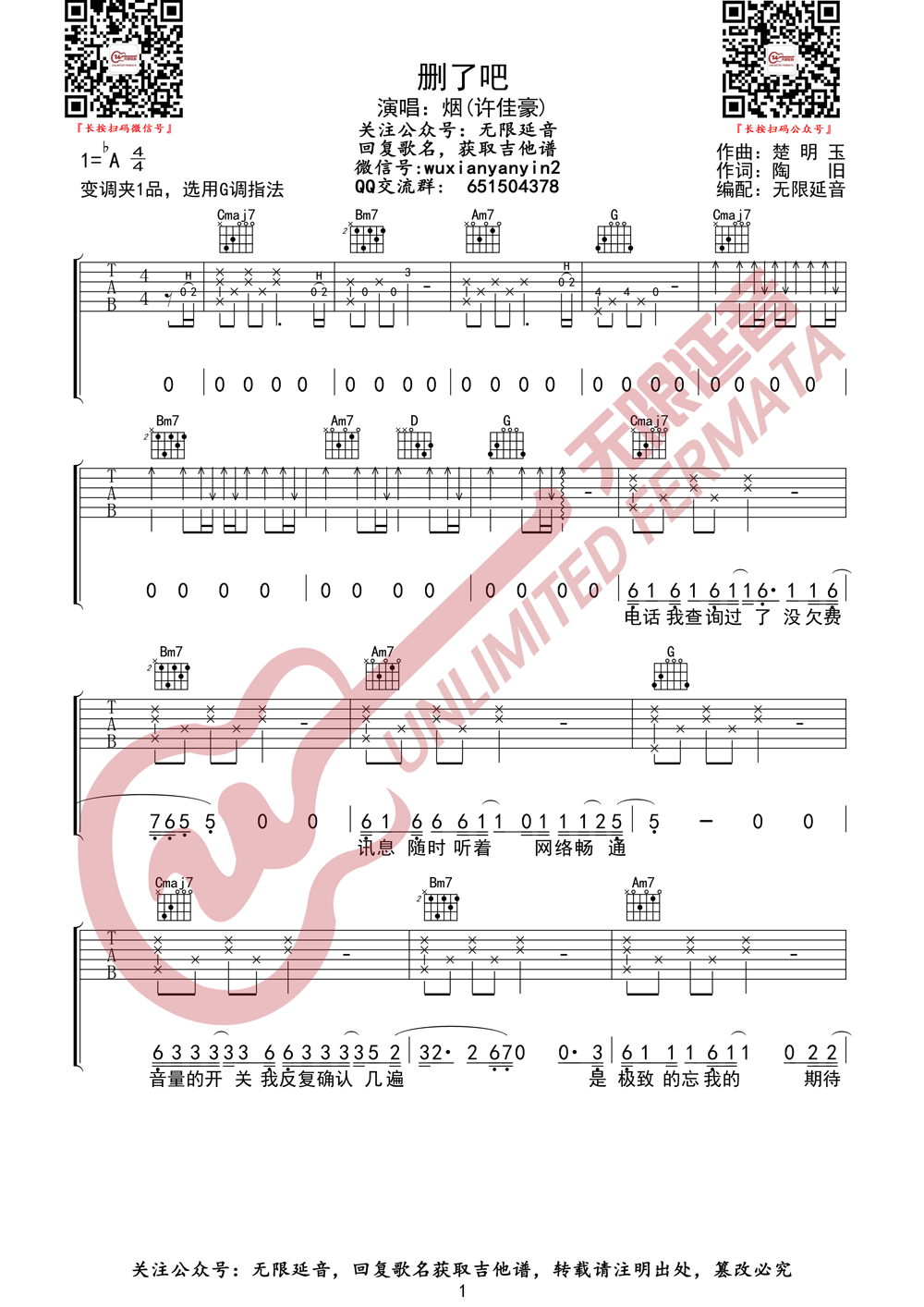 许佳豪(烟) 删了吧 吉他谱(无限延音编配)相关五线谱