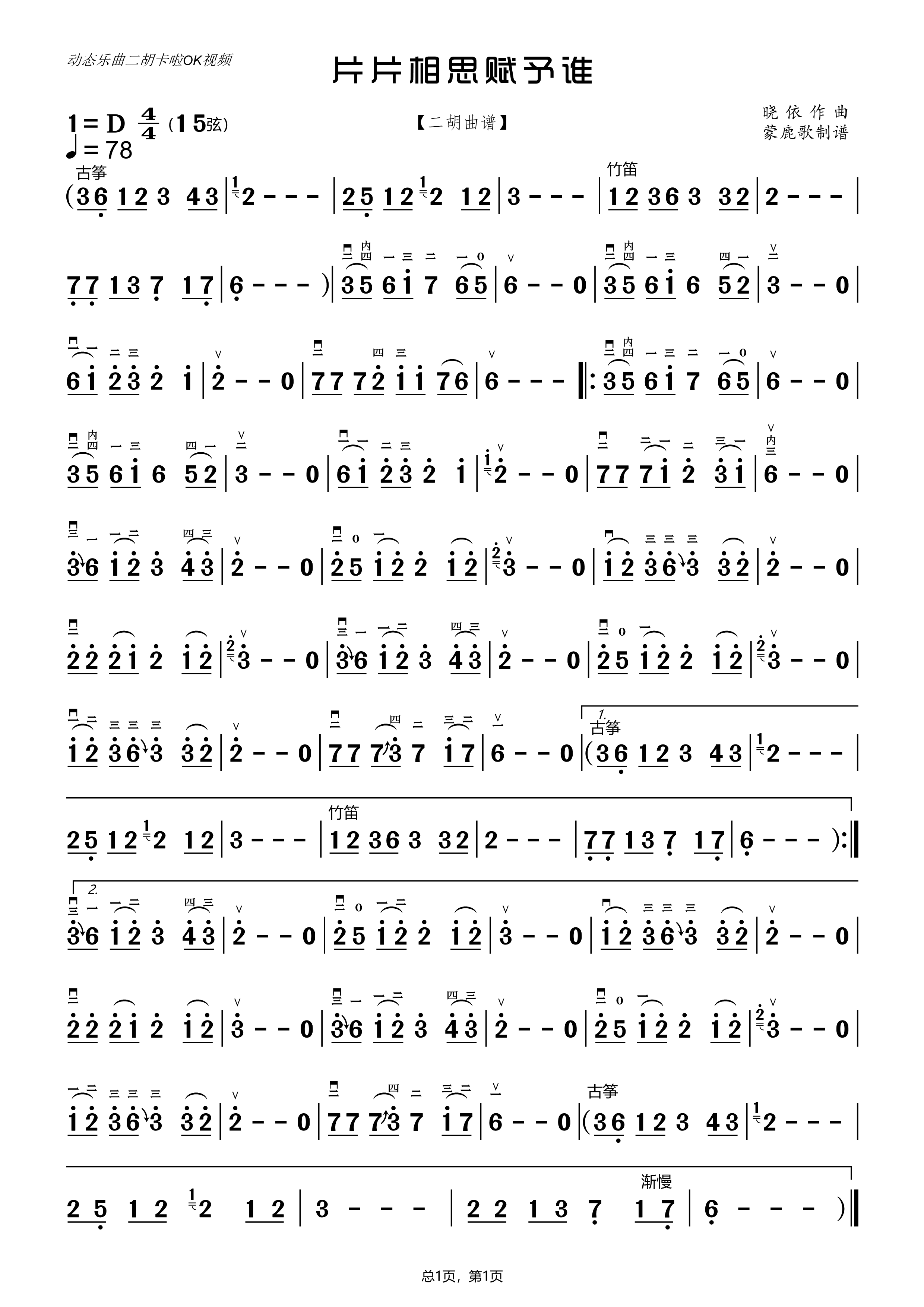 晓依曲谱推荐片片相思赋予谁(小E二胡演奏)泪水的故事一场秋雨一场凉片片相思赋予谁(演唱 晓 依)男人的伤悲(月夜清荷词 晓依曲)我的上上签放飞绿色的梦想片片相思赋予谁(晓依演唱版)相识相遇这知己爱穿透情柔情自古多感伤心悦君兮君不知