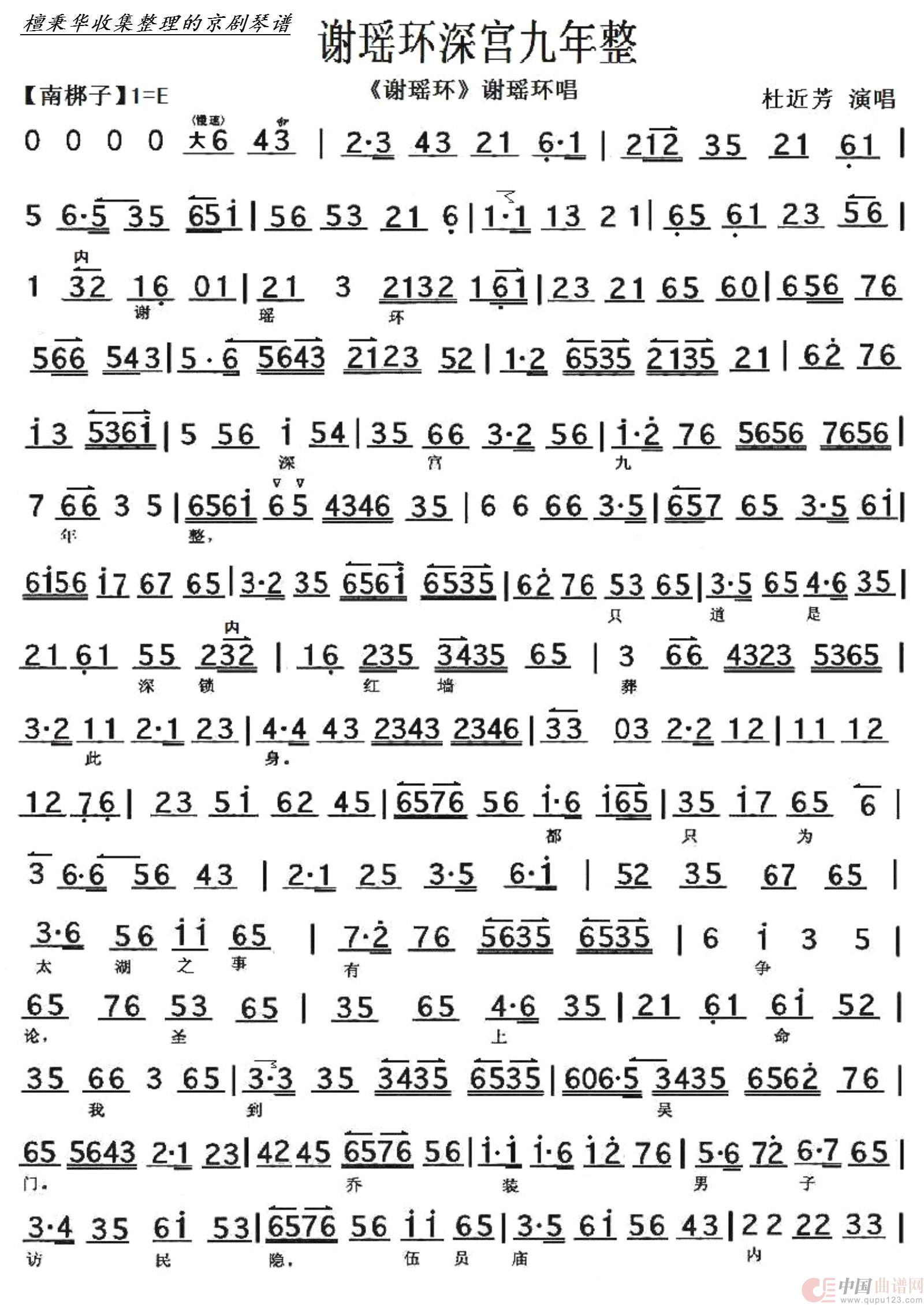 京剧《谢瑶环》谢瑶环深宫九年整(京胡伴奏谱)相关五线谱