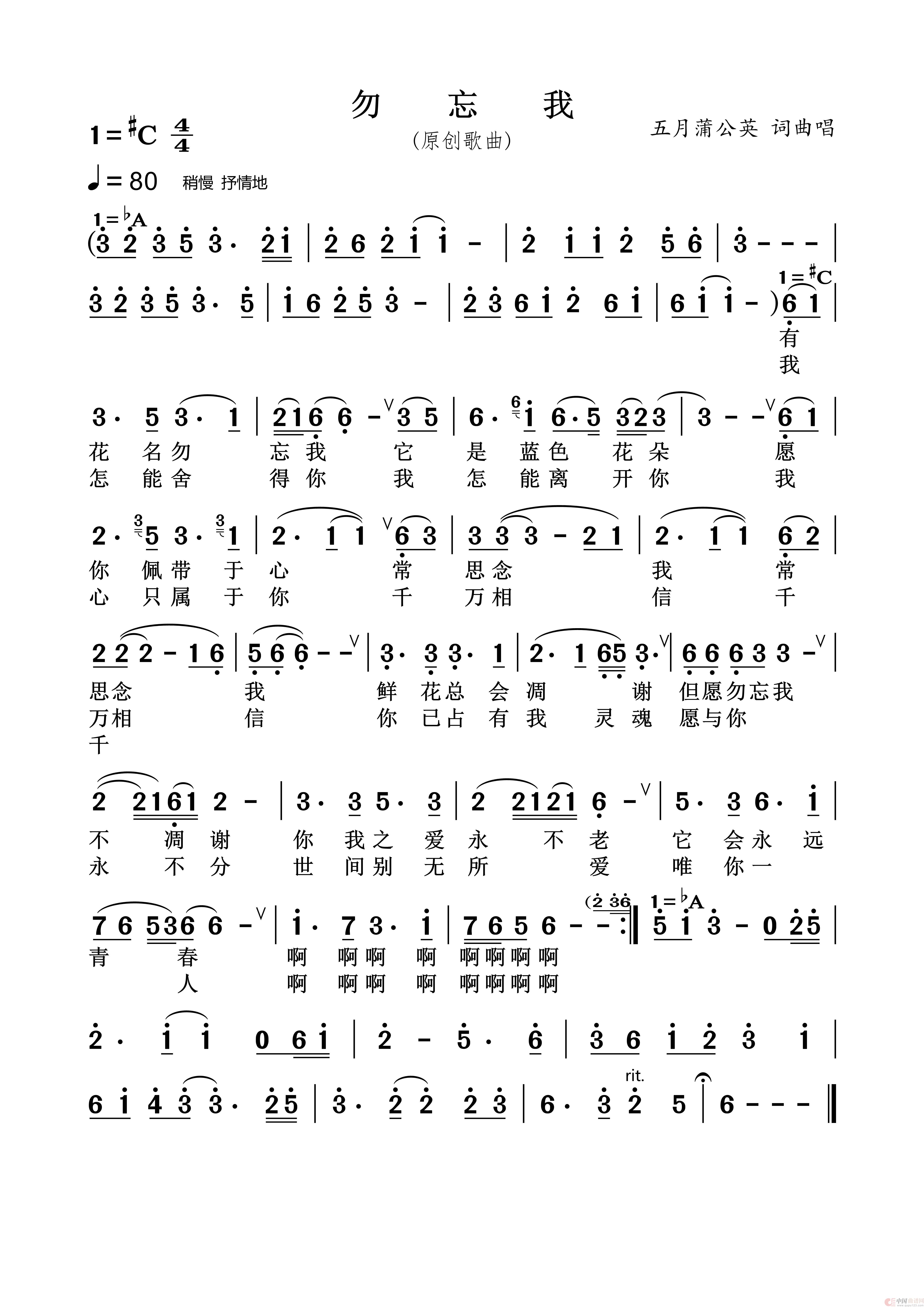 勿忘我(五月蒲公英 原创)相关五线谱