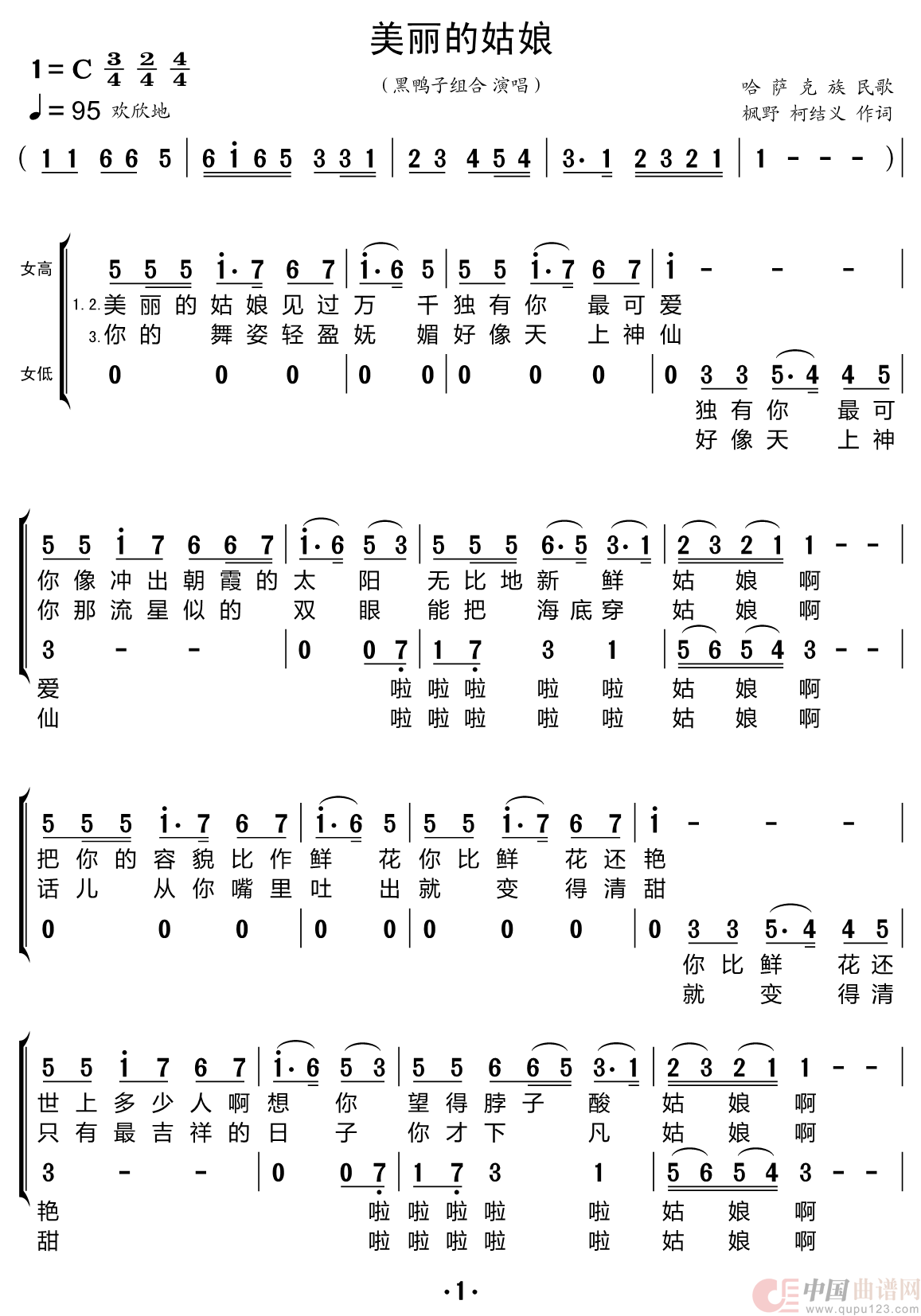 美丽的姑娘(黑鸭子组合)相关五线谱