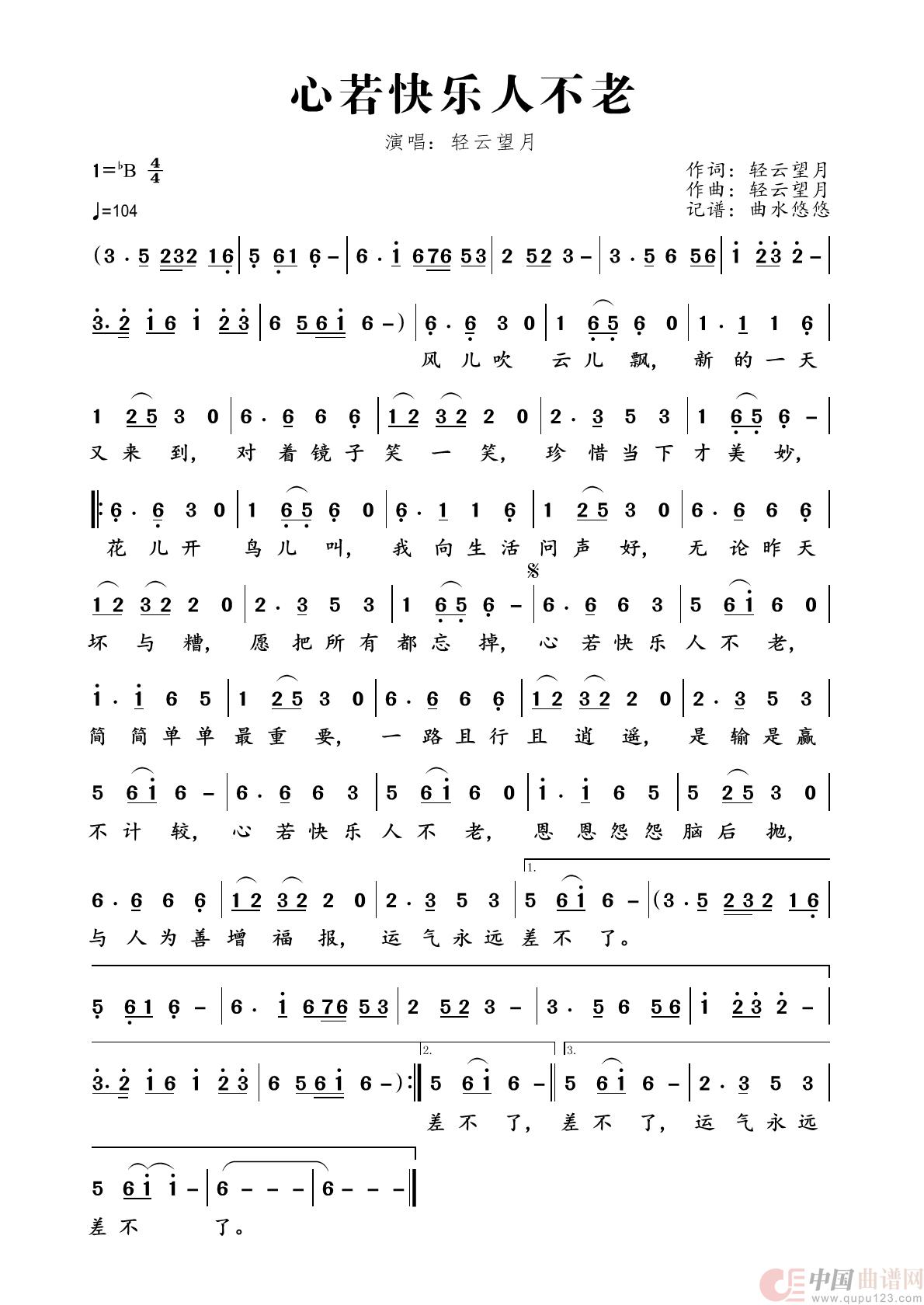轻云望月曲谱推荐亲爱的你在何处一辈子守护你(倪金茂词 轻云望月曲)我们一起爱祖国春心醉名利皆云烟一个家一个妈爱上飘雪的冬多情的牵挂(陈红卫词 轻云望月曲)女人本是花爱到深处爱的花朵开在心中梦中的格桑花(贺灵安词 轻云望月曲)我的思念在远方夜深人静更想你为你一醉解千愁(轻云望月词曲)活就要活个潇洒知足常乐情歌送给心爱的人好想牵住你的手人生一世太沧桑