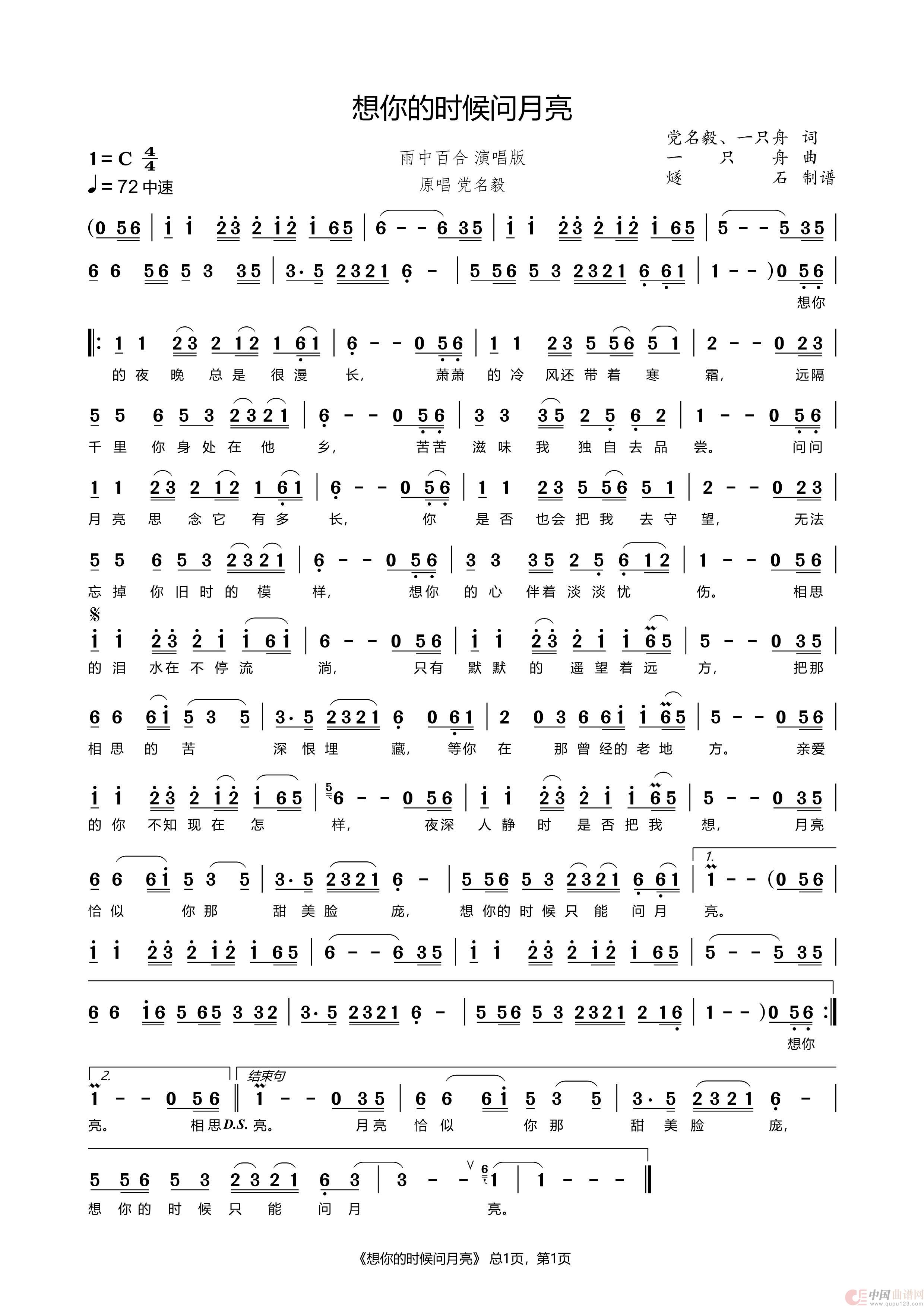 一只舟曲谱推荐想你的时候问月亮((雨中百合演唱))让我放心去爱你真心把你一生来守候(汪中秋、刘雅诗词 一只舟曲)伤不是所有人都会值得等(一只舟)来生再去拥抱你为你一生去守候(一只舟词曲)伤来生再去拥抱你爱的渡口一直等着你(一只舟词曲)下一个路口还为你等候(爱恨情愁词、一只舟曲)为你一生去等候想你的时候问月亮(崔伟立)对着月亮说声我爱你爱情十八拍想你的时候问月亮(梅朵)爱的世界不能没有你(蓝颜追雪词 一只舟曲)甘心情愿跟你走我是放羊小星星我把思念挂在天边(一只舟词曲)