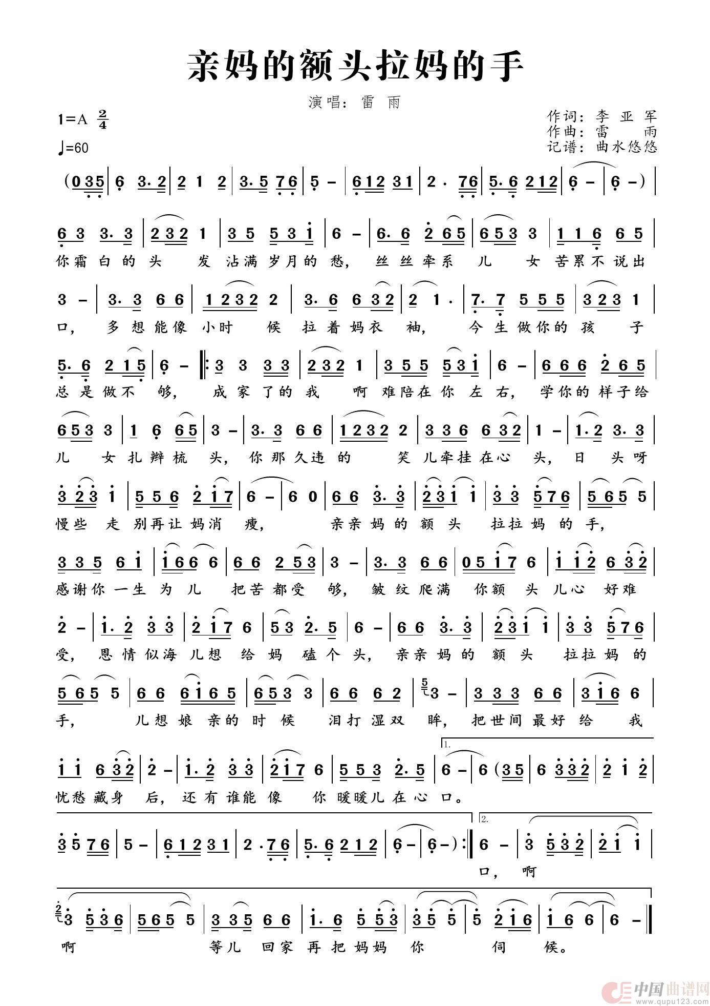 雷雨曲谱推荐你是月光里的海爱情可不能和摘苹果一样别亲人(电影《李冰》插曲)扬眉剑出鞘(雷雨声曲)山美只因为人心更美(故事片《林海情》插曲)甲板课堂中国海(雷雨词曲)故乡(管桦词 雷雨声曲)春天来了(高胡、古筝随想曲、福建民歌 )迎宾曲(刘文玉词 雷雨声曲)我的江河水残月(故事片《戈壁残月》主题歌)我在飞翔风雨难灭心中的火花(电视剧《乔厂长上任》主题歌)送你一瓶海水(陈道斌词 雷雨曲)敬爱的周总理,我们的好总理光荣啊!中国共青团(共青团团歌 杨慧配)伟大祖国一派春色开拓者进行曲青山留给后来人(电影《林海情》插曲)