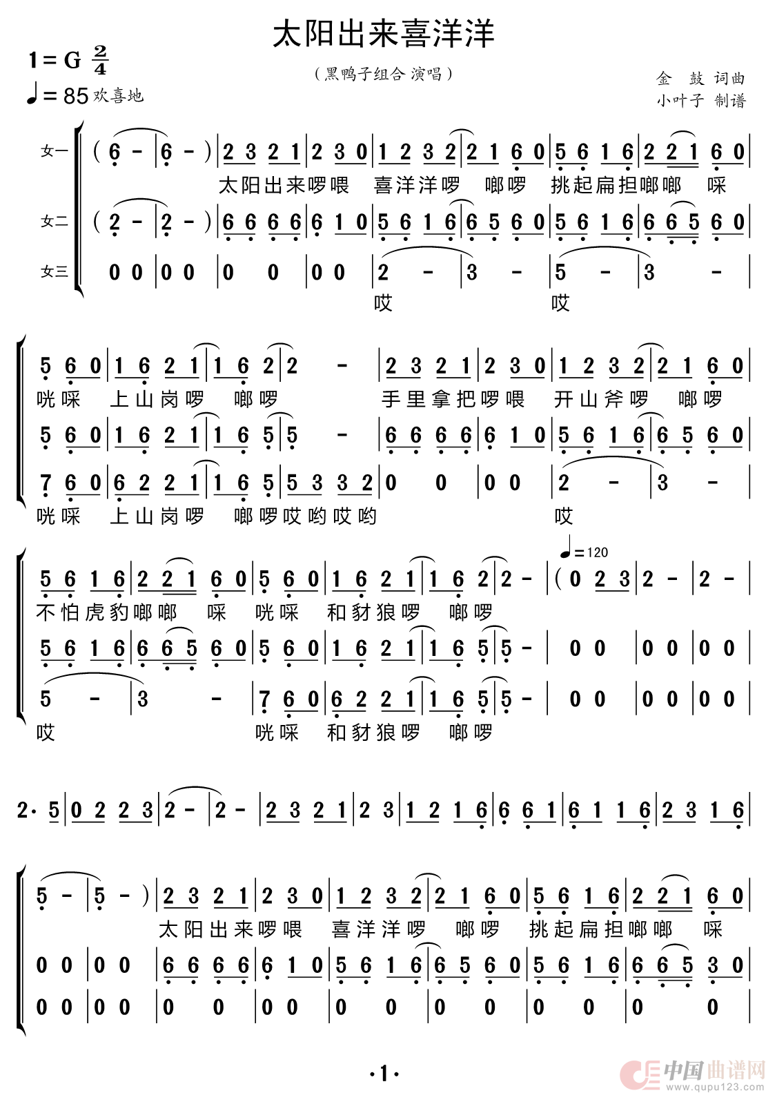 太阳出来喜洋洋(黑鸭子组合)相关五线谱