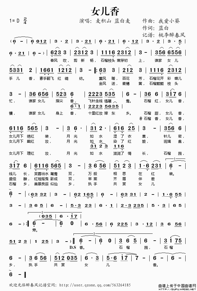 女儿香(我爱小葵词 蓝白曲)相关五线谱