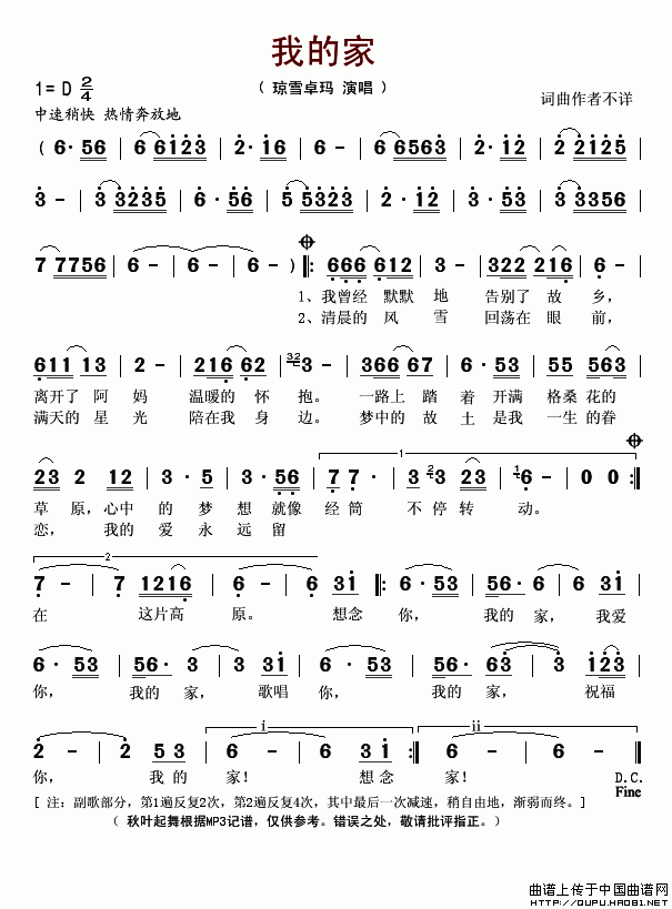 我的家(琼雪卓玛演唱版)相关五线谱